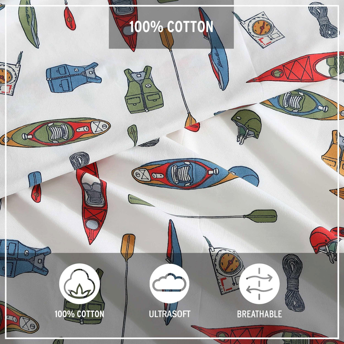 Add a splash of adventure to your bedding with the Eddie Bauer Kayak Adventure Sheet Set. Featuring colorful kayak prints on crisp, breathable 100% cotton percale, this set brings the spirit of the outdoors inside. The fitted sheet is fully elasticized for a secure fit, and OEKO-TEX certified dyes ensure eco-friendly comfort. Machine washable for easy care.