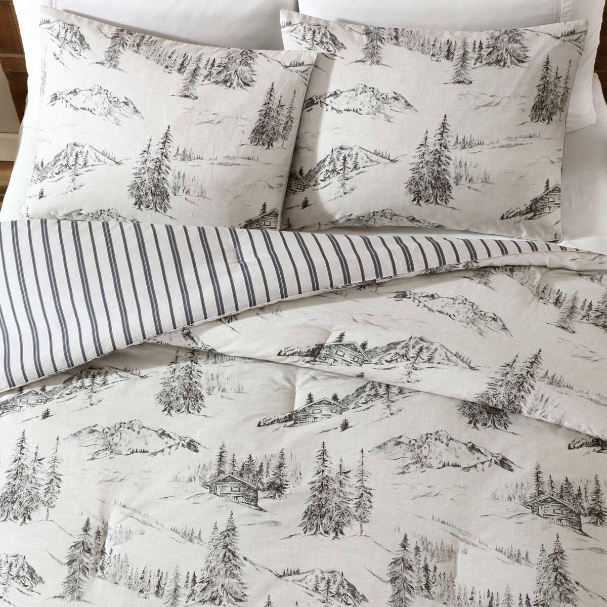 Turn your bedroom into a retreat with the Eddie Rocky Mountain Comforter Set. The outdoor inspired design reverses to a classic stripe. This super soft comforter is sure to keep you warm and cozy throughout those frigid winter nights. The comforter is 100% cotton and has a 100% polyester fill. The included shams feature a two-piece center closure. Layer in our Eddie Bauer sheet sets and accessories to create a unique look. The ensemble is machine washable for easy care.