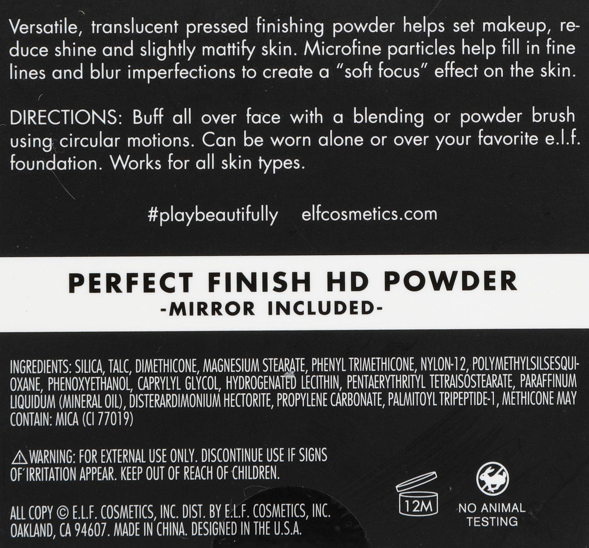 This Perfect Finish HD Powder from Elf features a versatile, translucent finishing powder that helps set makeup and reduce shine. Helps mask fine lines and imperfections for radiant-looking skin. Expiration 12 months from first use. Vegan and cruelty-free. 0.28 oz.