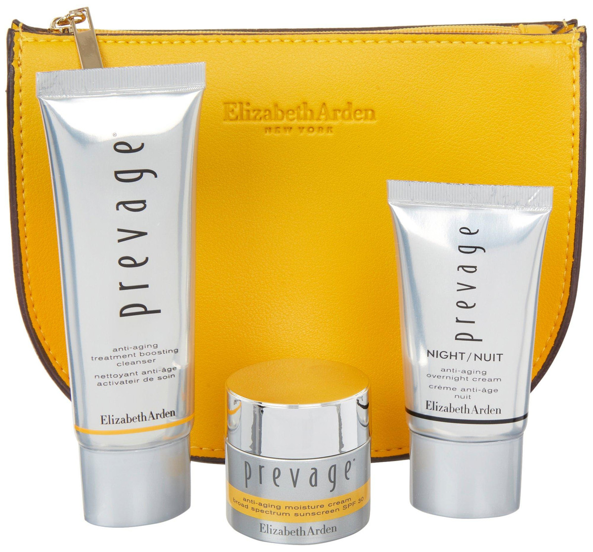 Introducing the 4 Pc Prevage Skin Care Set, your ultimate anti-aging solution. This set includes an anti-aging treatment boosting cleanser, a broad spectrum SPF 30 sunscreen moisture cream, and an overnight anti-aging cream, all designed to rejuvenate and protect your skin. It also comes with a stylish faux leather zip pouch for convenient storage.