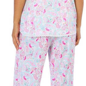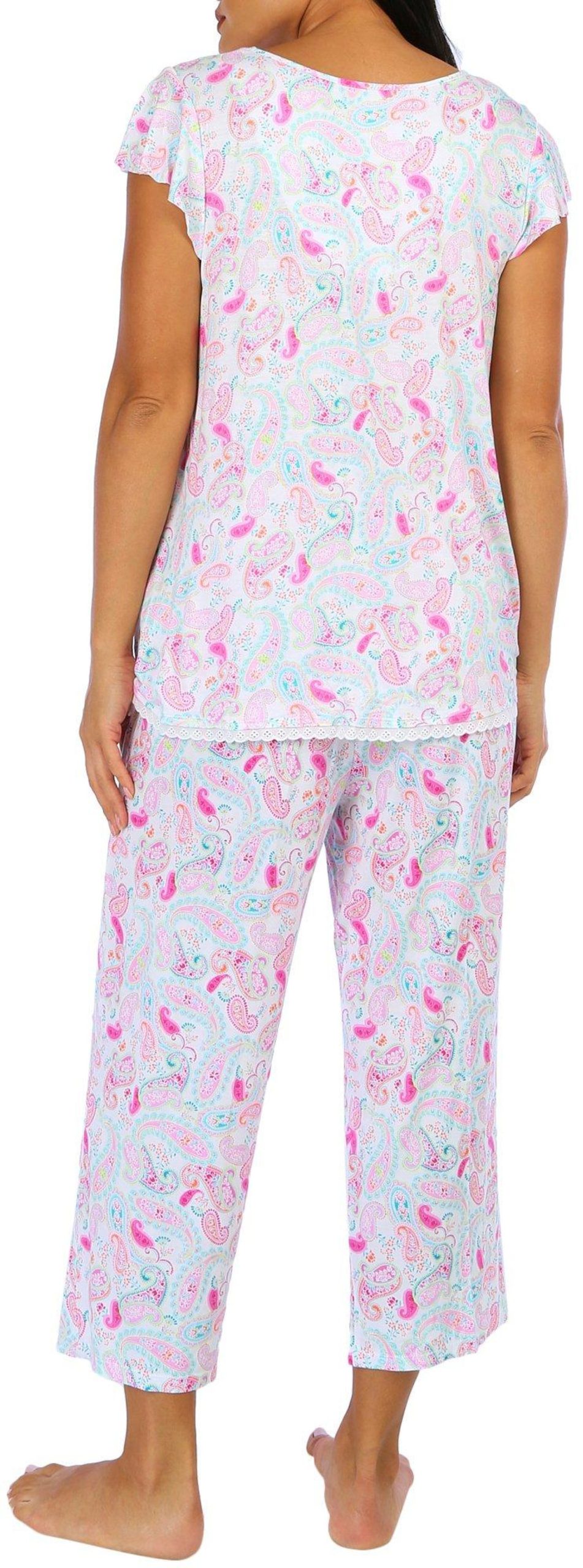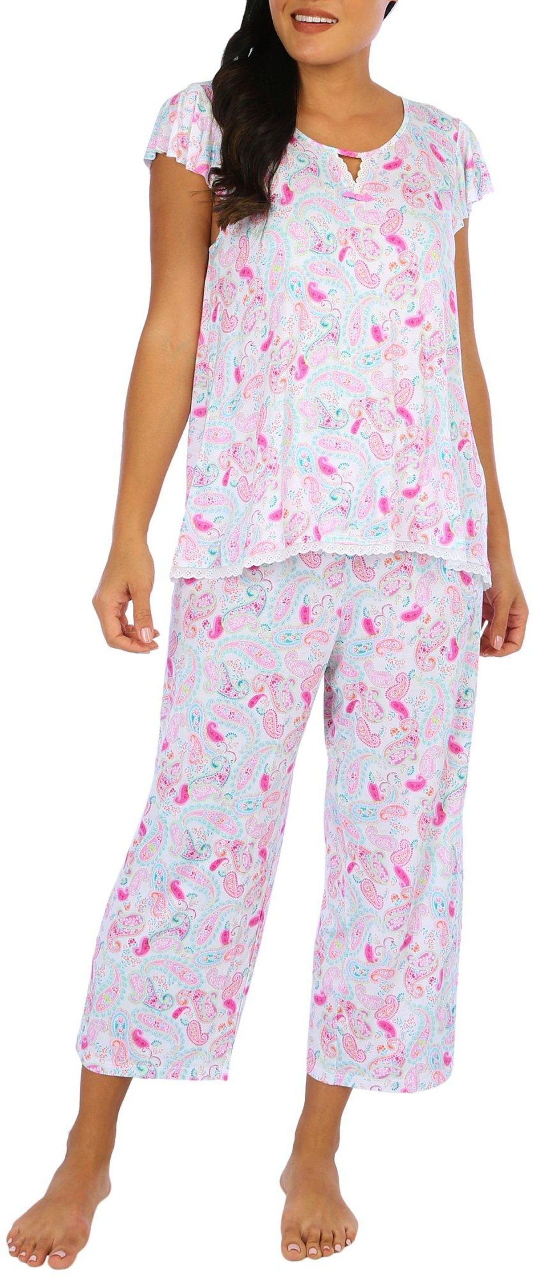 Sleep comfortably in this 2-piece sleep set featuring a print pattern on soft lightweight knit fabric, a scoop neck flutter sleeve top with eyelet lace hemline trim, and pull-on drawstring elastic waist capris. The top length measures approximately 26 in. The inseam measures approximately 23 in. Fabrication 95% rayon, 5% spandex.
