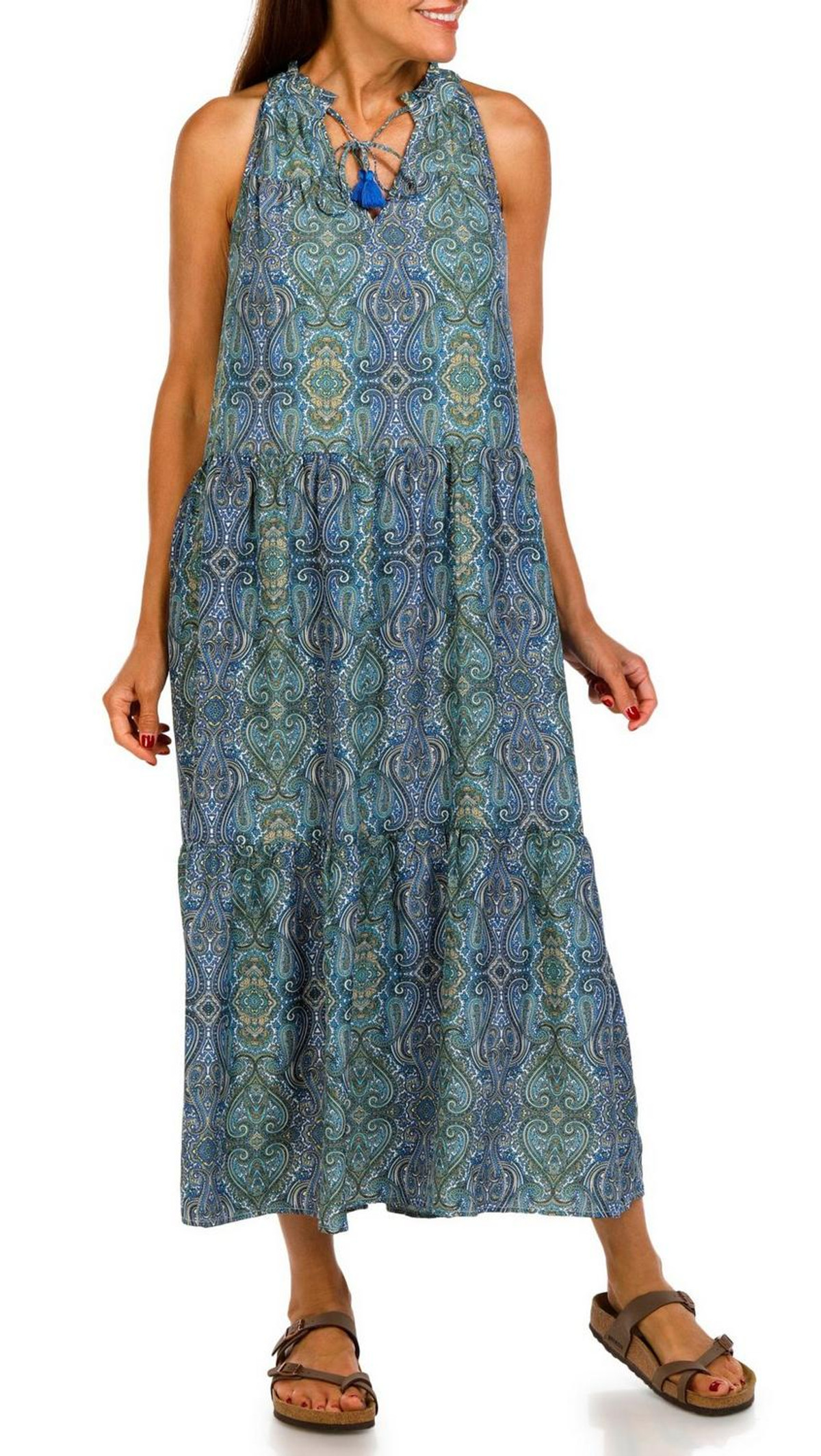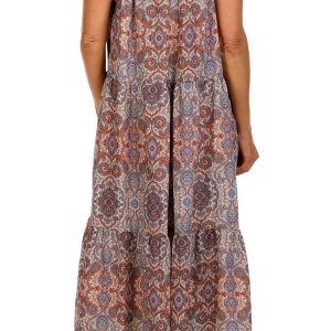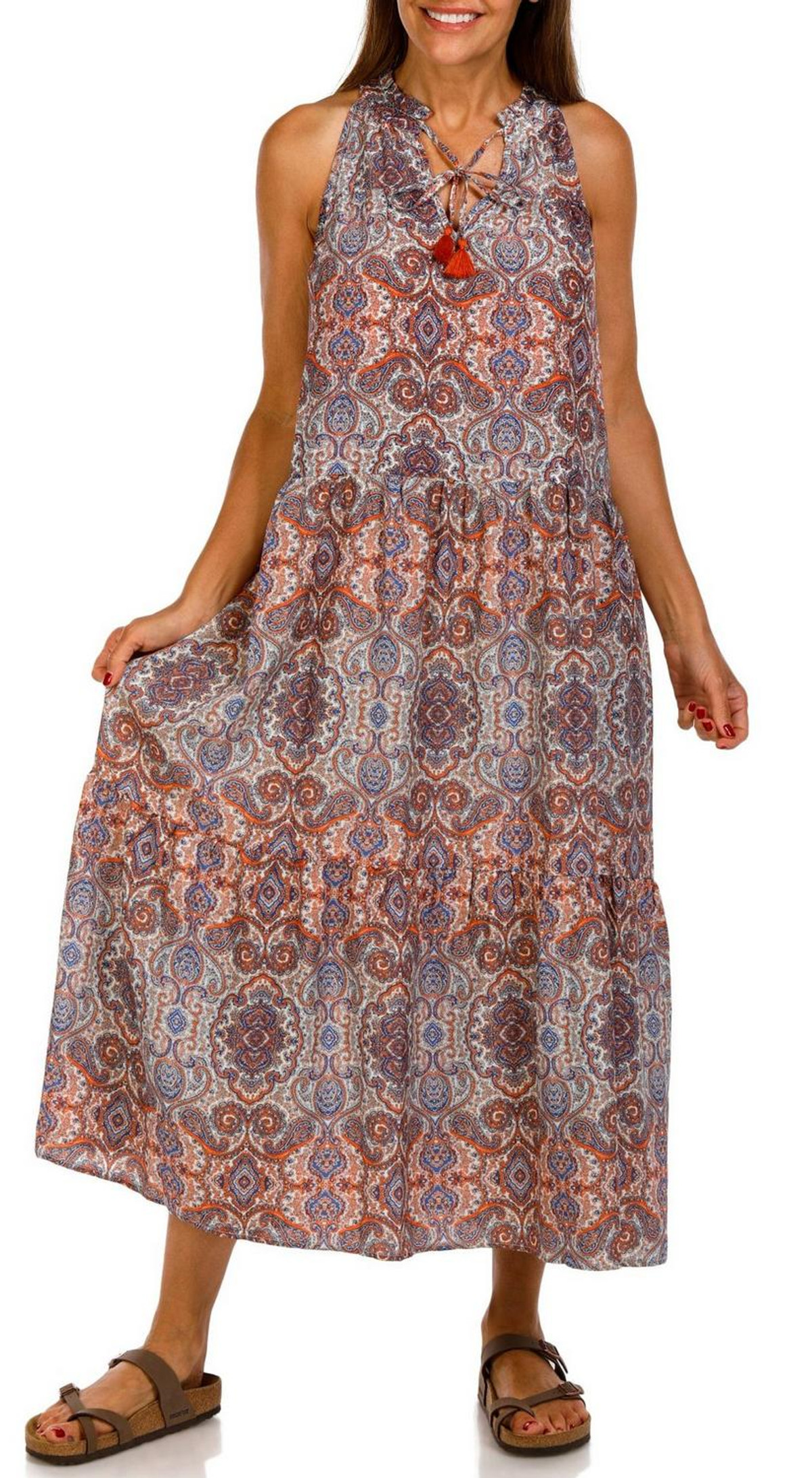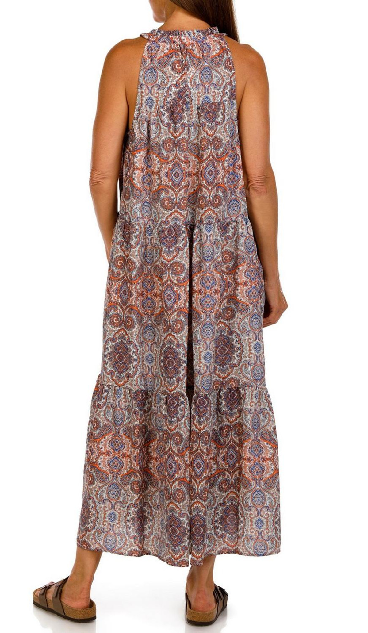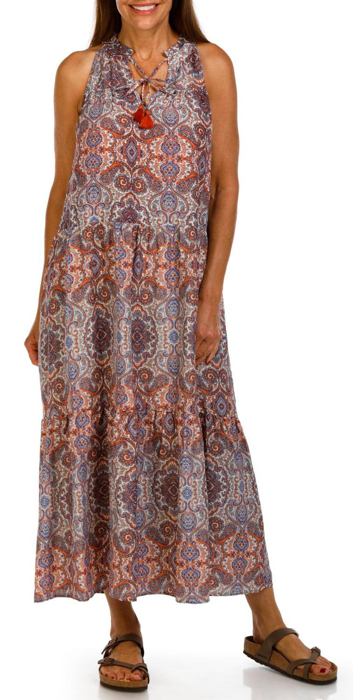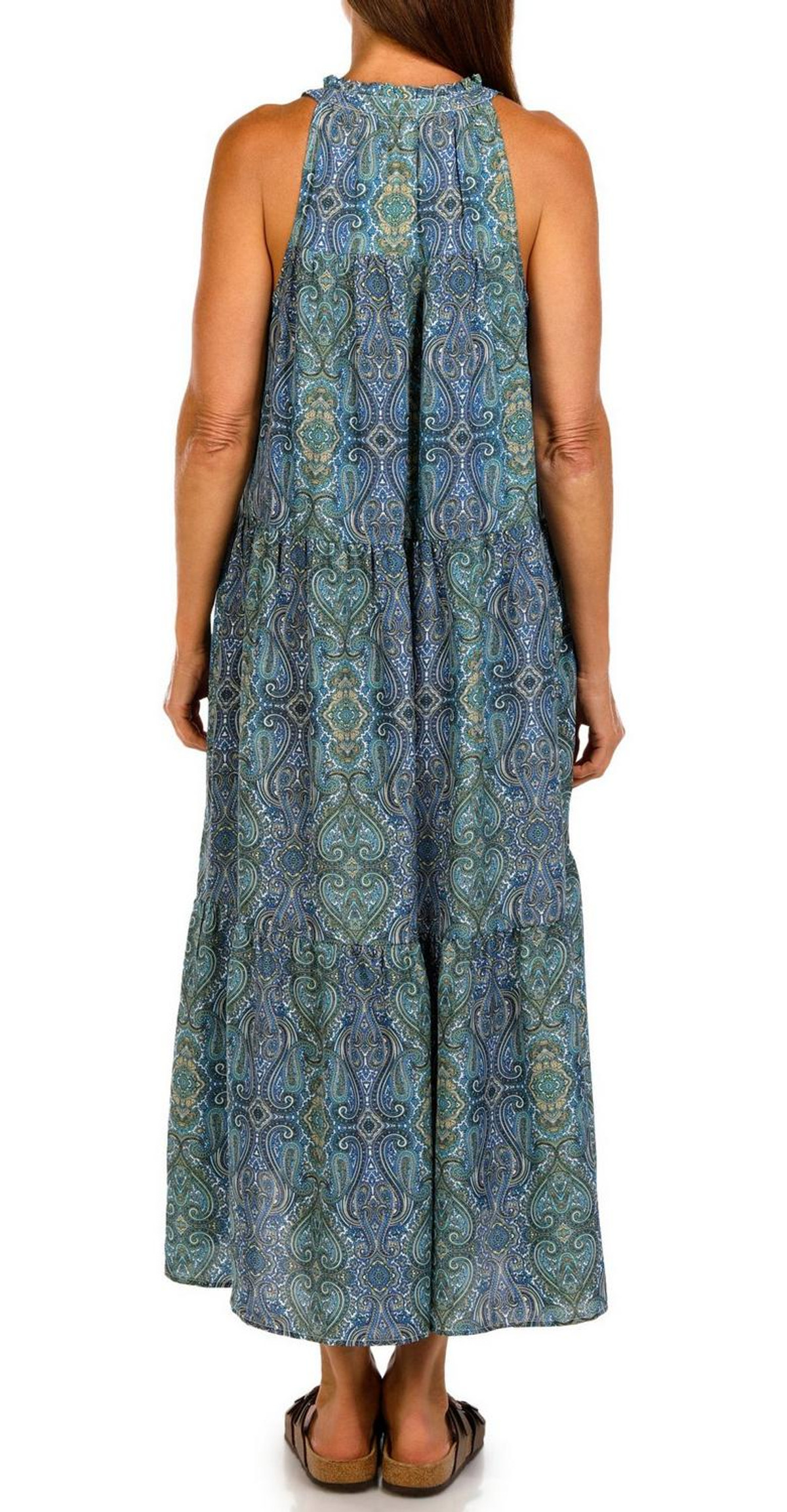 Turn heads in effortless style with this sleeveless maxi dress, showcasing a bold print and flattering halter neckline. Designed to flow gracefully with every step, its lightweight fabric offers breezy comfort for beach strolls, sunny afternoons, or elegant evening escapes. A must-have piece for warm-weather wanderlust and carefree sophistication. Fabrication is 100% polyester.