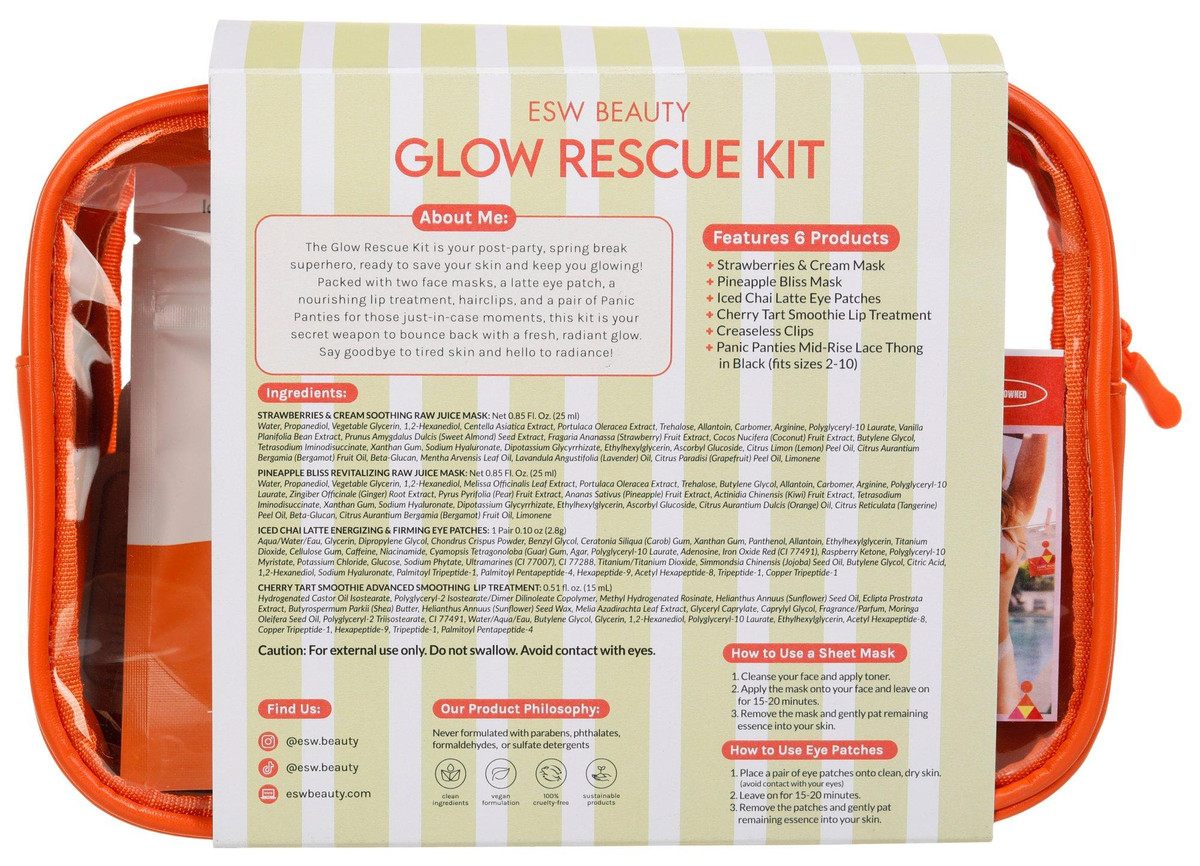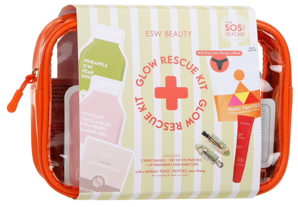 This rescue kit includes a Pineapple Bliss Revitalizing Sheet Mask, a Strawberries & Cream Soothing Sheet Mask, firming eye patches, a nourishing lip treatment, a set of creaseless hair clips and a pair of emergency panties.