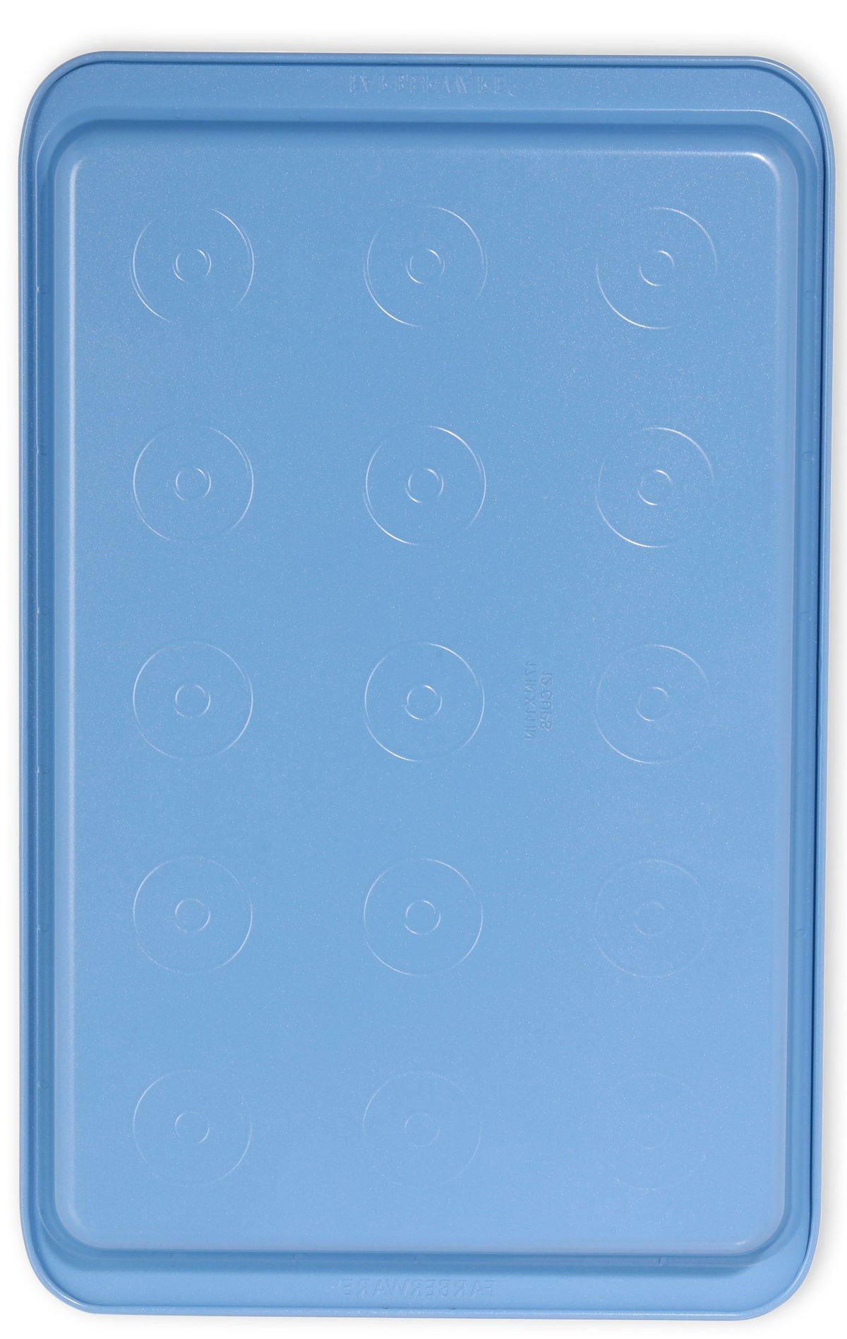 Designed for convenient, easy baking, this sheet pan boasts a sturdy, heavy-duty steel construction which resists warping, and has two layers of smooth, durable, easy-release nonstick. Unique features include cookie outlines on the pan that show you just where to plop down your dough and lines to help guide cutting into equal portions.