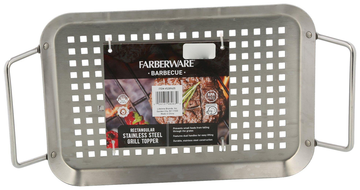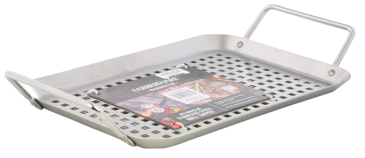 This Farberware BBQ Rectangular Grill Topper creates a safe surface on your grill to cook smaller foods so they don’t fall through the grates and also provides a designated space on the grill if you want to keep delicate foods separated from meats. Made of stainless steel, the topper allows heat and air to flow through while keeping your food on top. Use oven mitts to safely remove the topper from the grill using the convenient dual handles. Measures 14 in x 8 in.