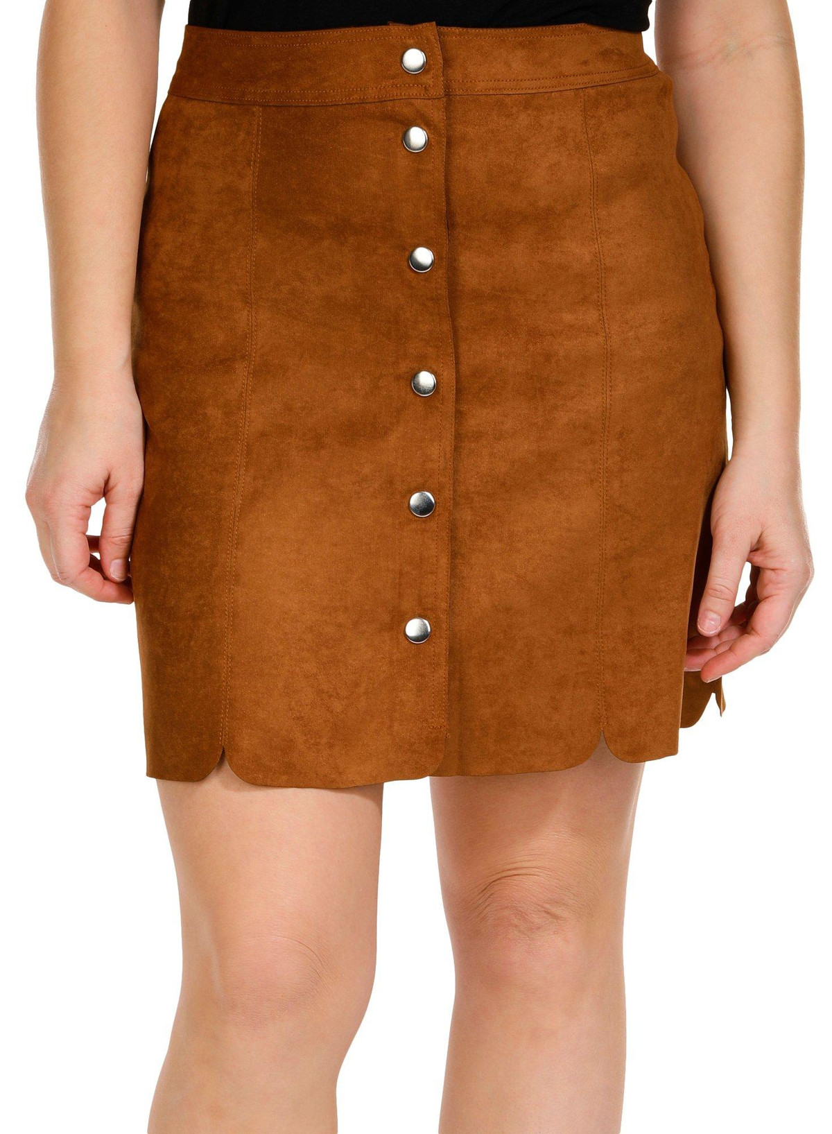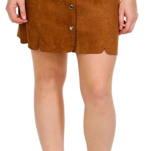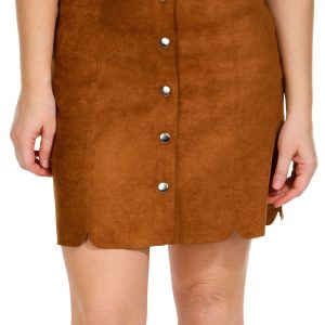 Introducing our Women’s Faux Suede Button Down Skirt, a chic and versatile addition to your wardrobe. Made from a blend of cotton and spandex, this skirt offers a soft, comfortable feel with a touch of stretch. It features a stylish solid color, a full front button-down closure, and a unique scalloped hem. With a 17-inch length from the waist, this skirt is perfect for both casual and dressy occasions.