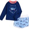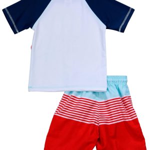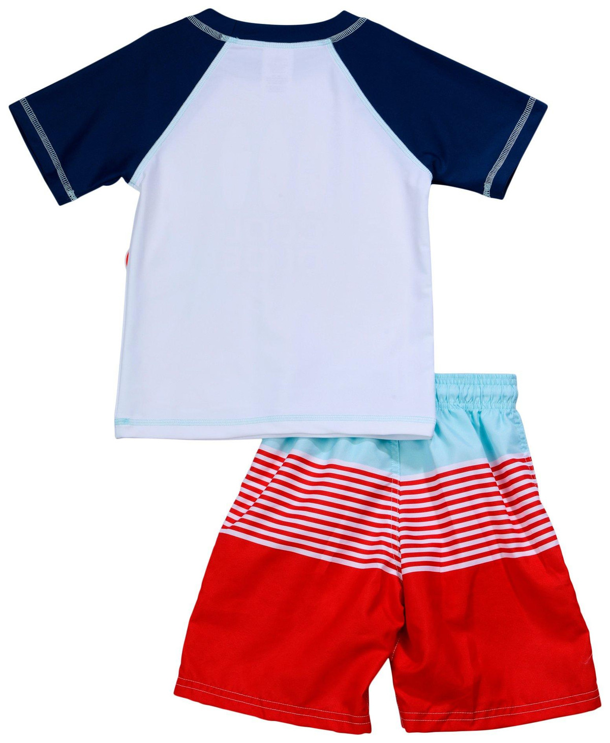 Introducing the Little Boys 2 Piece Cool Dude Rashguard and shorts Set, designed for fun and protection. This set includes a short sleeve rash guard featuring a playful graphic design and UPF 50 protection to keep your child safe from the sun, as well as drawstring swim shorts. Made from performance stretch material, it ensures comfort and flexibility. The set is completed with matching dinosaur print swim shorts, making it perfect for a day at the beach or pool.