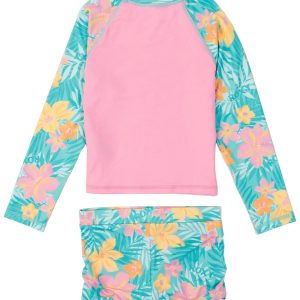 Introducing the Little Boys 2 Piece Cool Dude Rashguard and shorts Set, designed for fun and protection. This set includes a short sleeve rash guard featuring a playful graphic design and UPF 50 protection to keep your child safe from the sun, as well as drawstring swim shorts. Made from performance stretch material, it ensures comfort and flexibility. The set is completed with matching dinosaur print swim shorts, making it perfect for a day at the beach or pool.