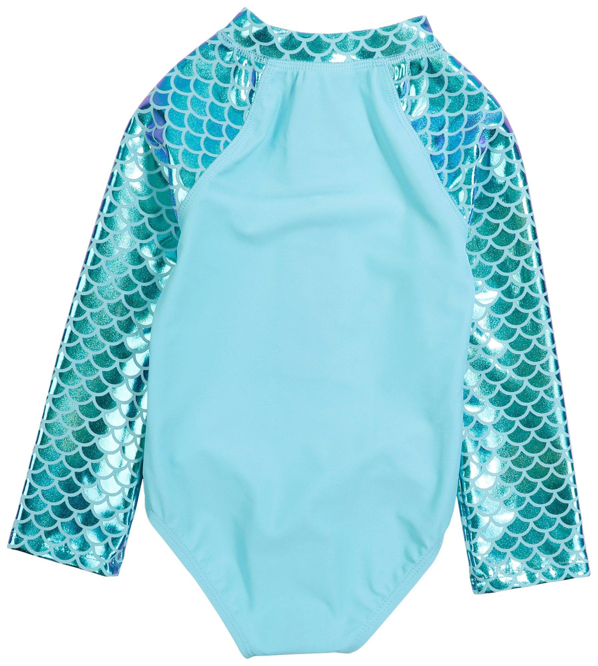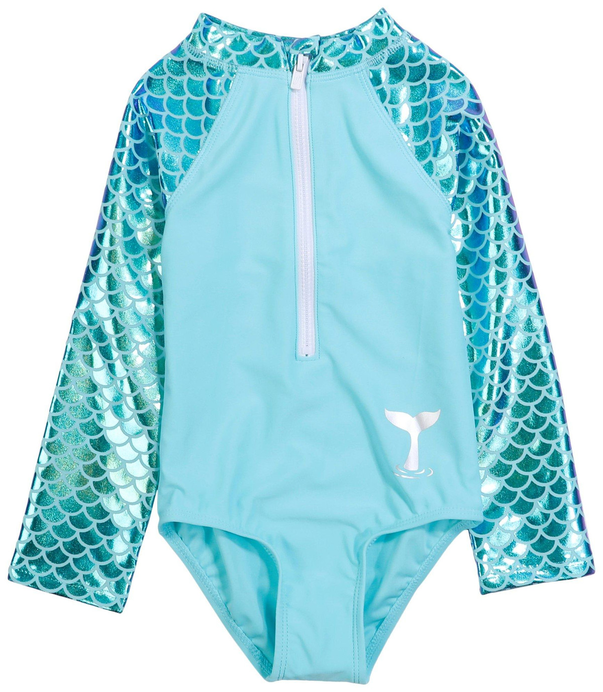 Make a splash in our Mermaid Rash Guard Swimsuit! Featuring UPF 50+ sun protection, a 3/4-zip front with a chin guard, and dazzling foil scale print raglan sleeves. Fully lined for comfort and crafted with stretch for the perfect fit. Fabrication: 86% polyester, 14% spandex. Lining: 100% polyester.