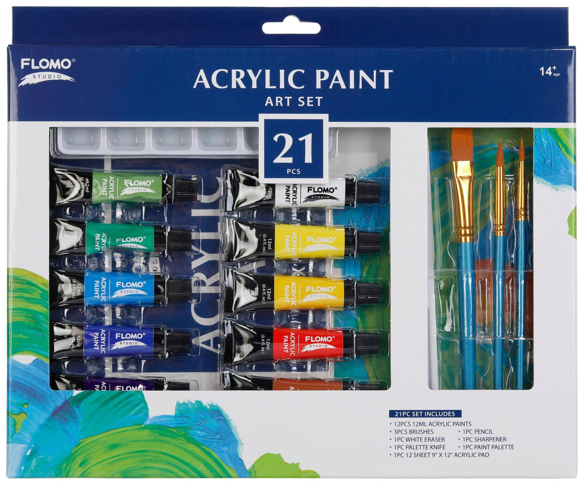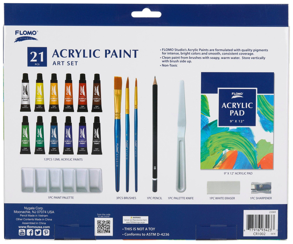 Explore your artistic side with the FLOMO Creative 21 pc Acrylic Paint Art Set, designed for ages 14 and up. Includes 12 vibrant (12ml) acrylic paints, 3 brushes, a palette, palette knife, pencil, eraser, sharpener and a 9×12 acrylic pad. Made with quality pigments for rich color and smooth coverage, this non-toxic set is perfect for beginners or experienced artists.