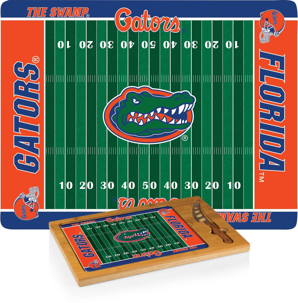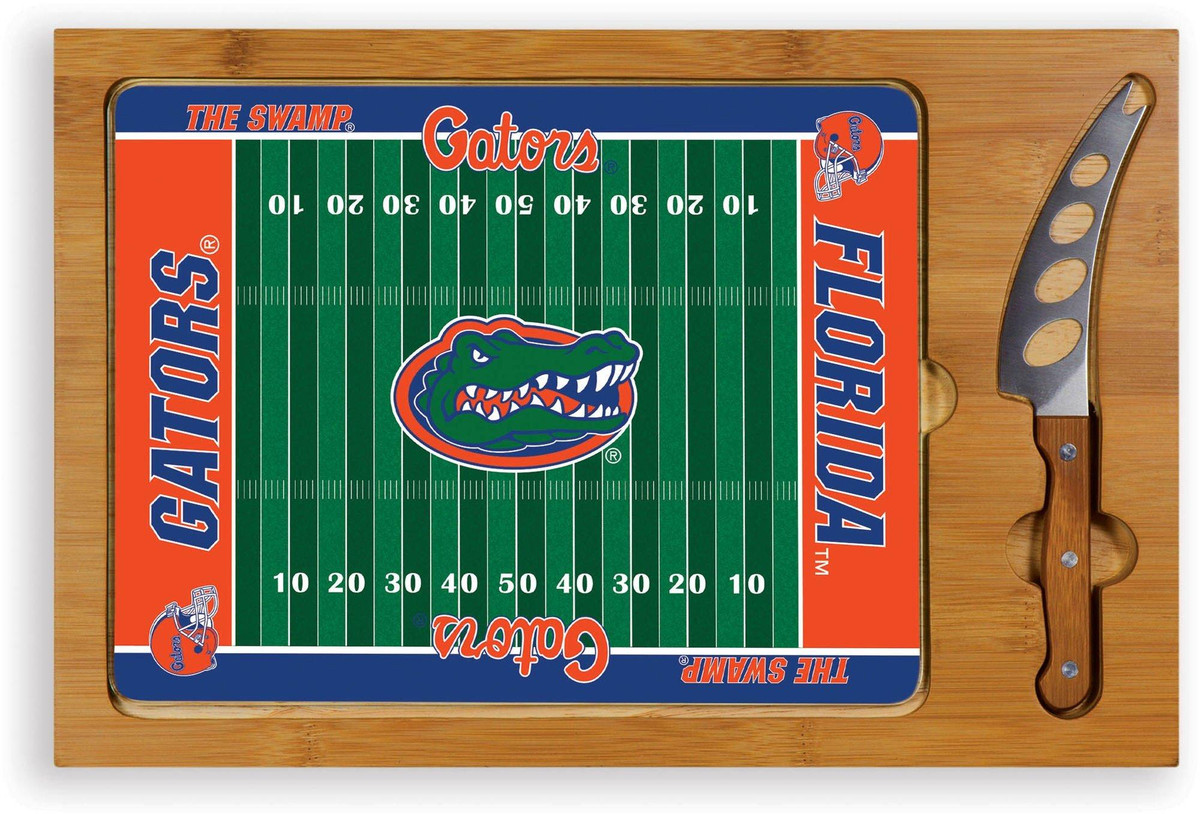 The Icon Florida Gators Cutting Board is a 3-pc. set that has a solid rubberwood base with a bamboo rim accent, a tempered glass lid, & a cheese knife with its own carved out area in the wood base. Measures 15.2”L x 10”W x .8”H.