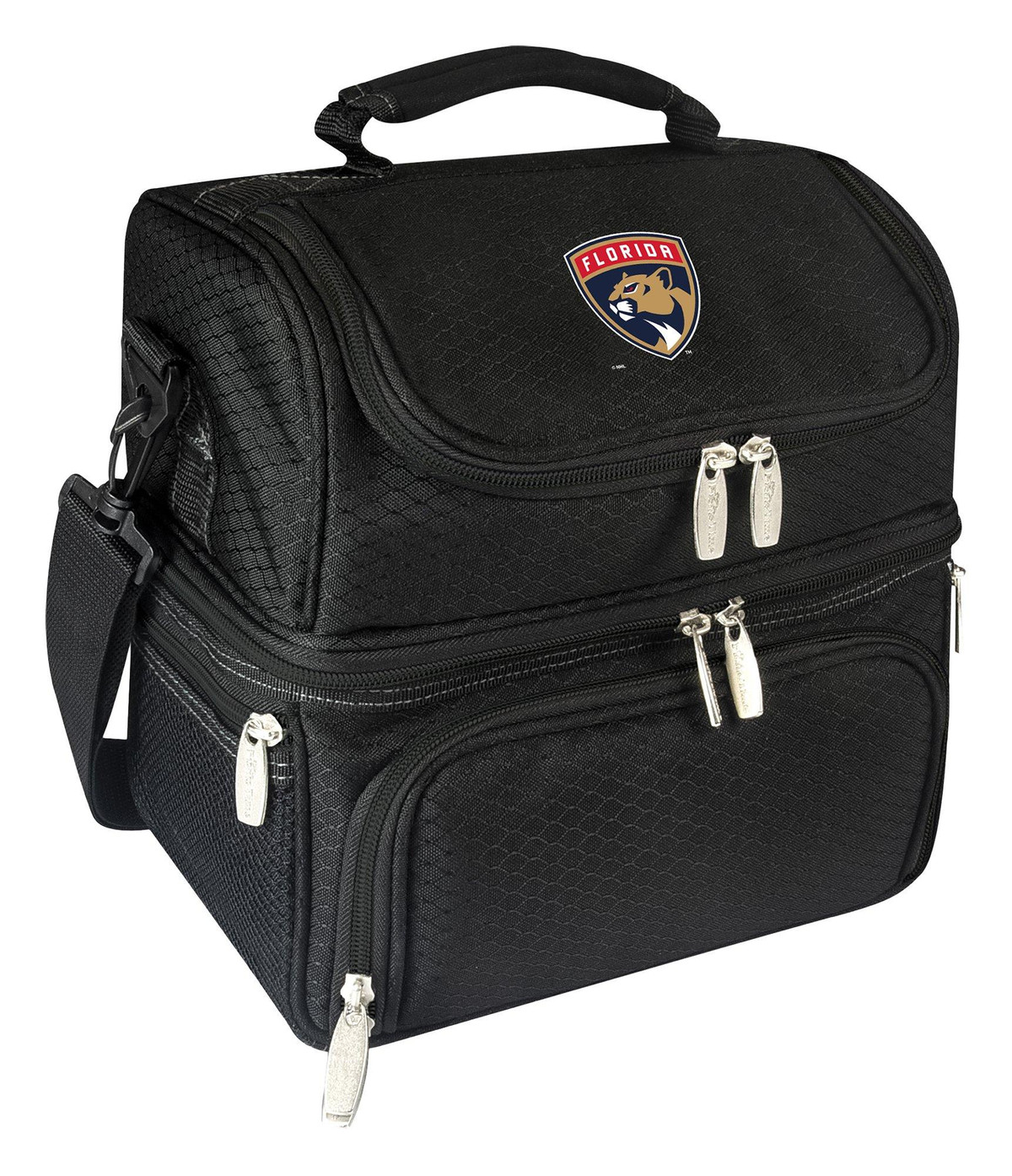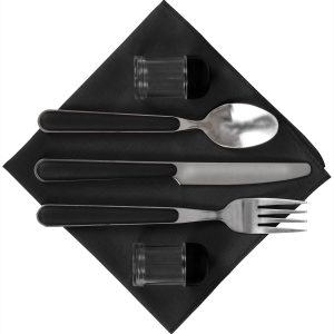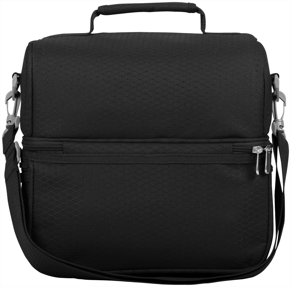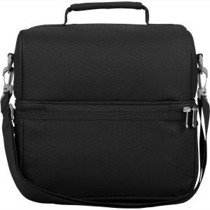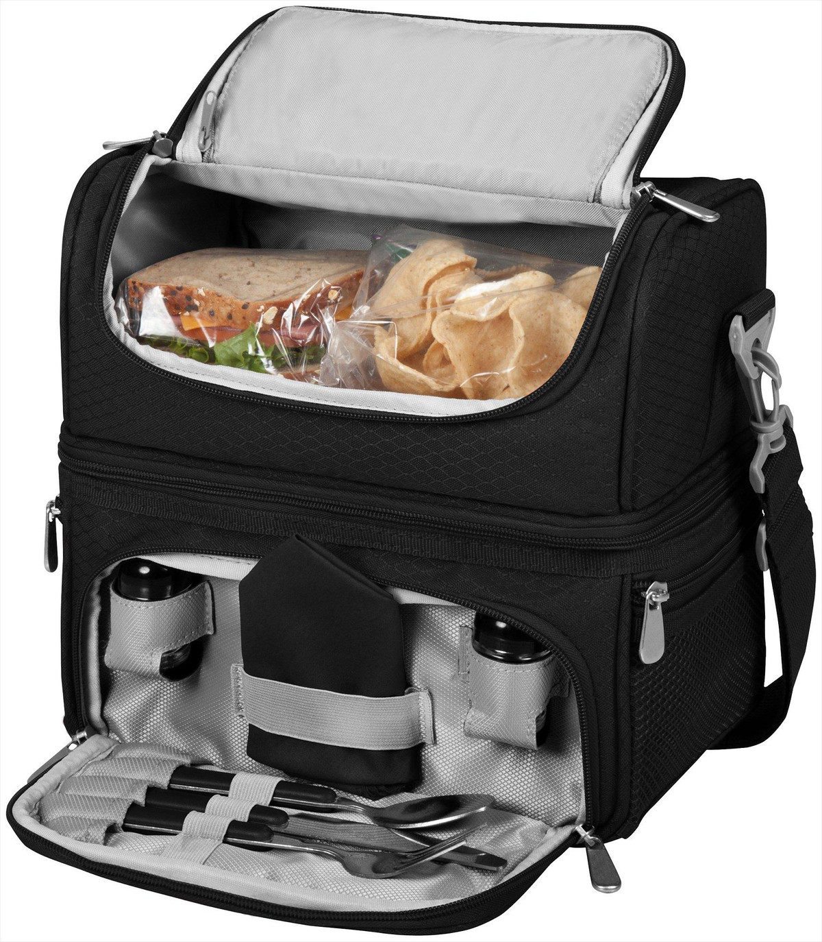 The Pranzo insulated lunch box is made of polyester and features adjustable shoulder strap, soft grip handle, side mesh pockets, and a hidden flatware section with 1 stainless steel fork, knife, and spoon, salt & pepper shaker and 1 cotton napkin. Measures 12”L x 8”W x 11”H.