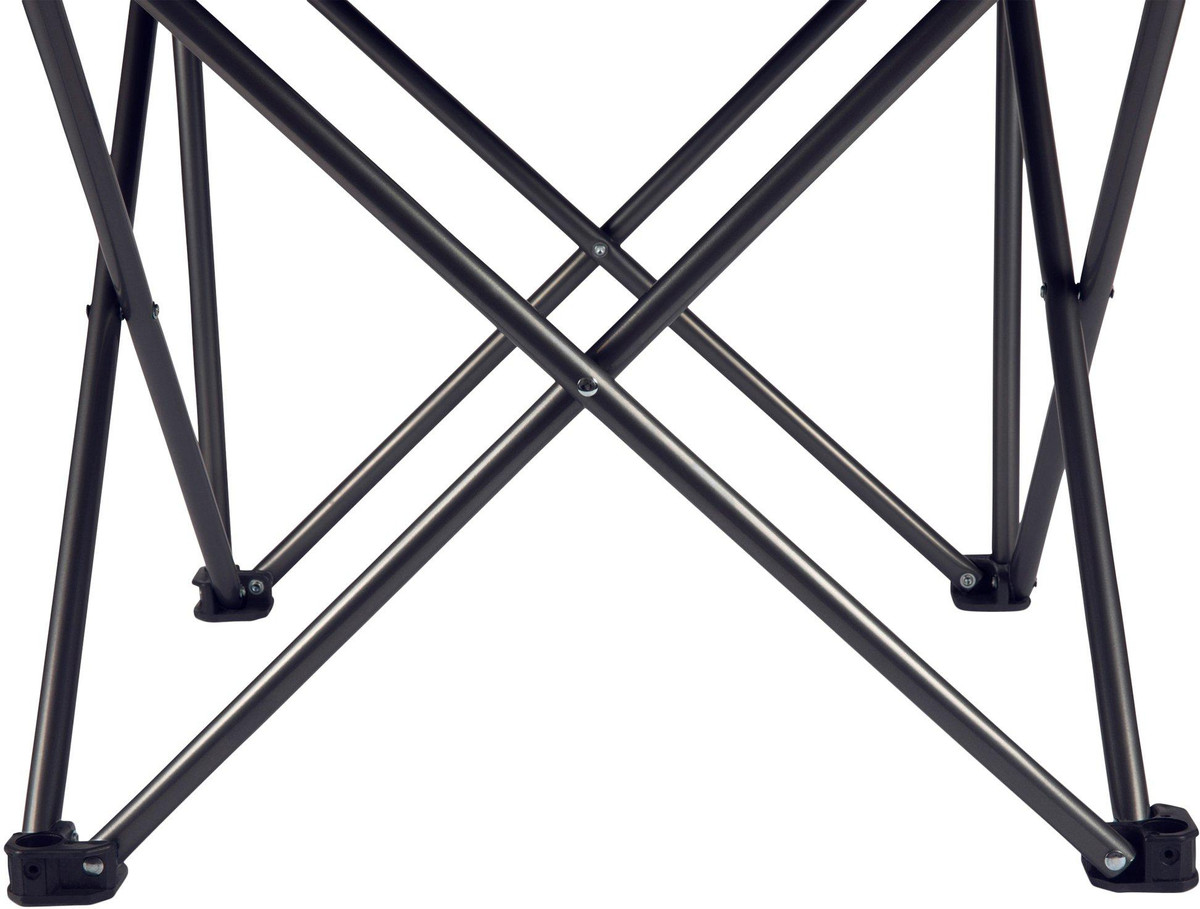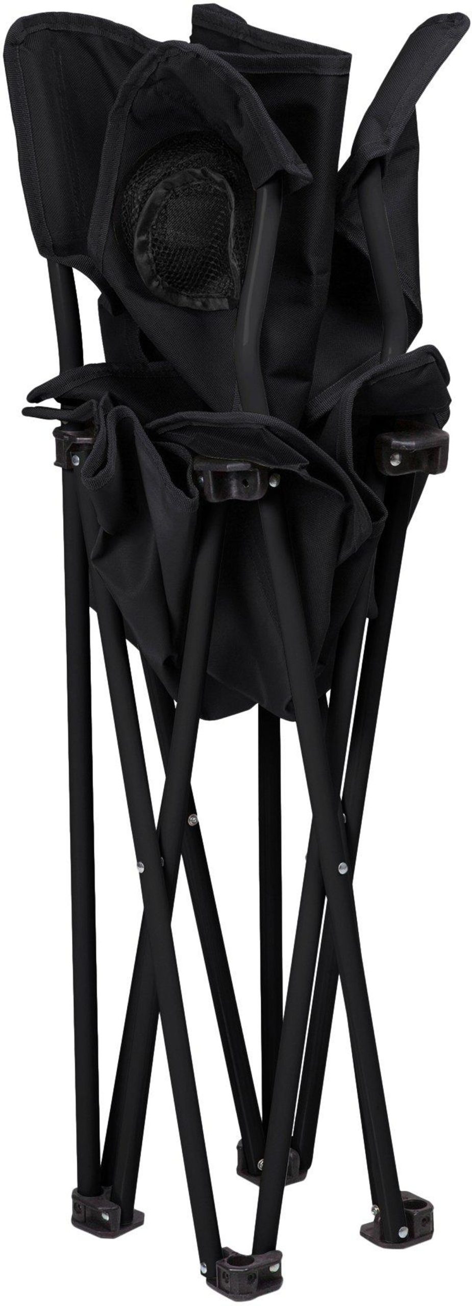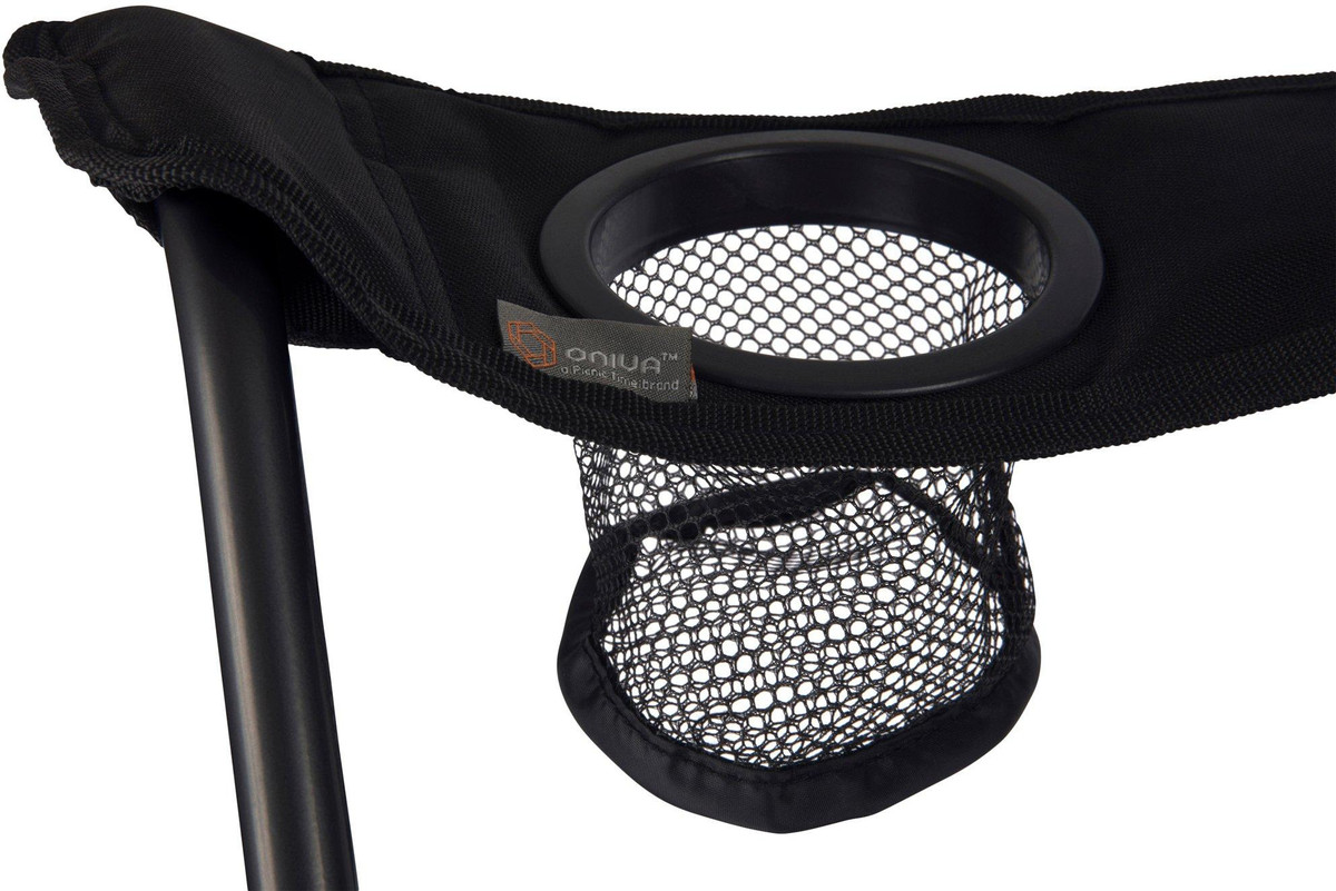 PTZ Camp Chair features a simple and quick set-up design, a natural recline, a mesh drink holder in the right armrest, and a sturdy frame that folds into a drawstring carrying bag with shoulder strap. Measures 16 x 21 x 19.25 inches. Weight capacity 300 lbs.