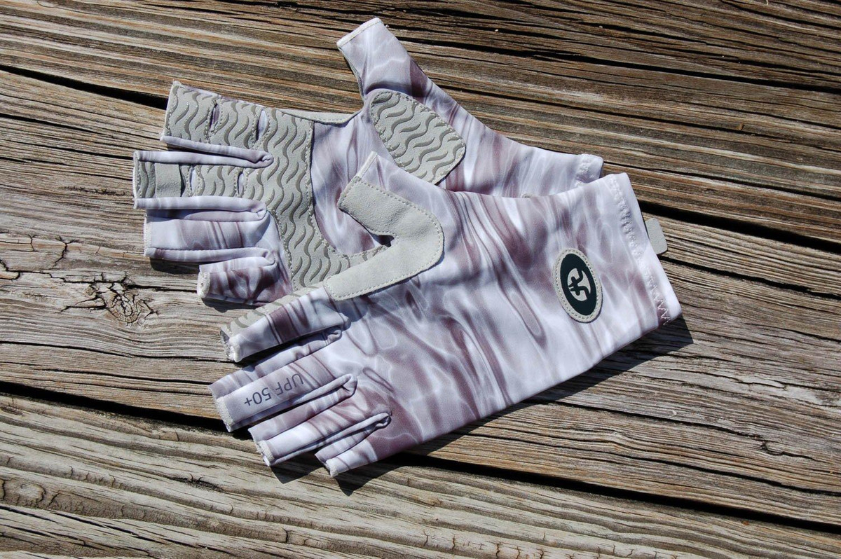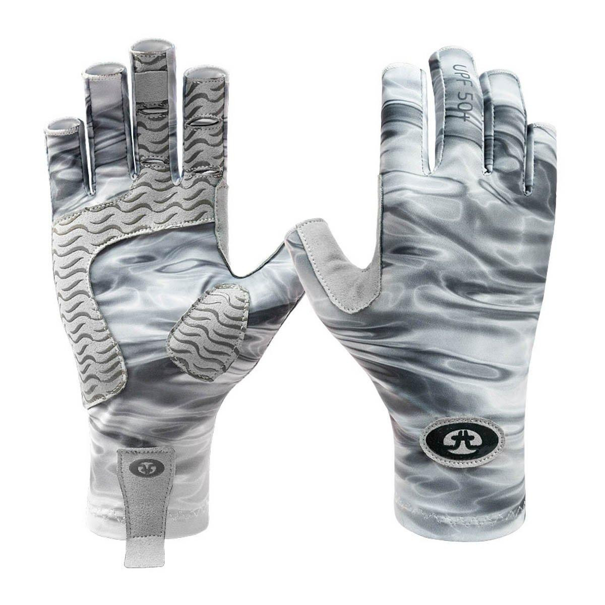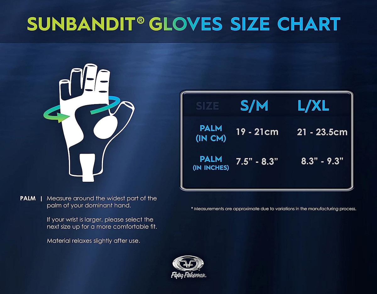 Flying Fisherman Sunbandit Pro Series Fishing Gloves have a half-finger design to improve flexibility and dexterity. Easy on-off wrist and finger pull tabs help to slip on fast when you need them and off when you dont. The silicone synthetic leather padding on palm and fingers add for a better grip and increased durability. Featuring an extended cuff and 50+ UPF protection from the suns harmful UV rays. Made of breathable, 4-way stretch poly-spandex fabric that fits snugly and dries quickly.