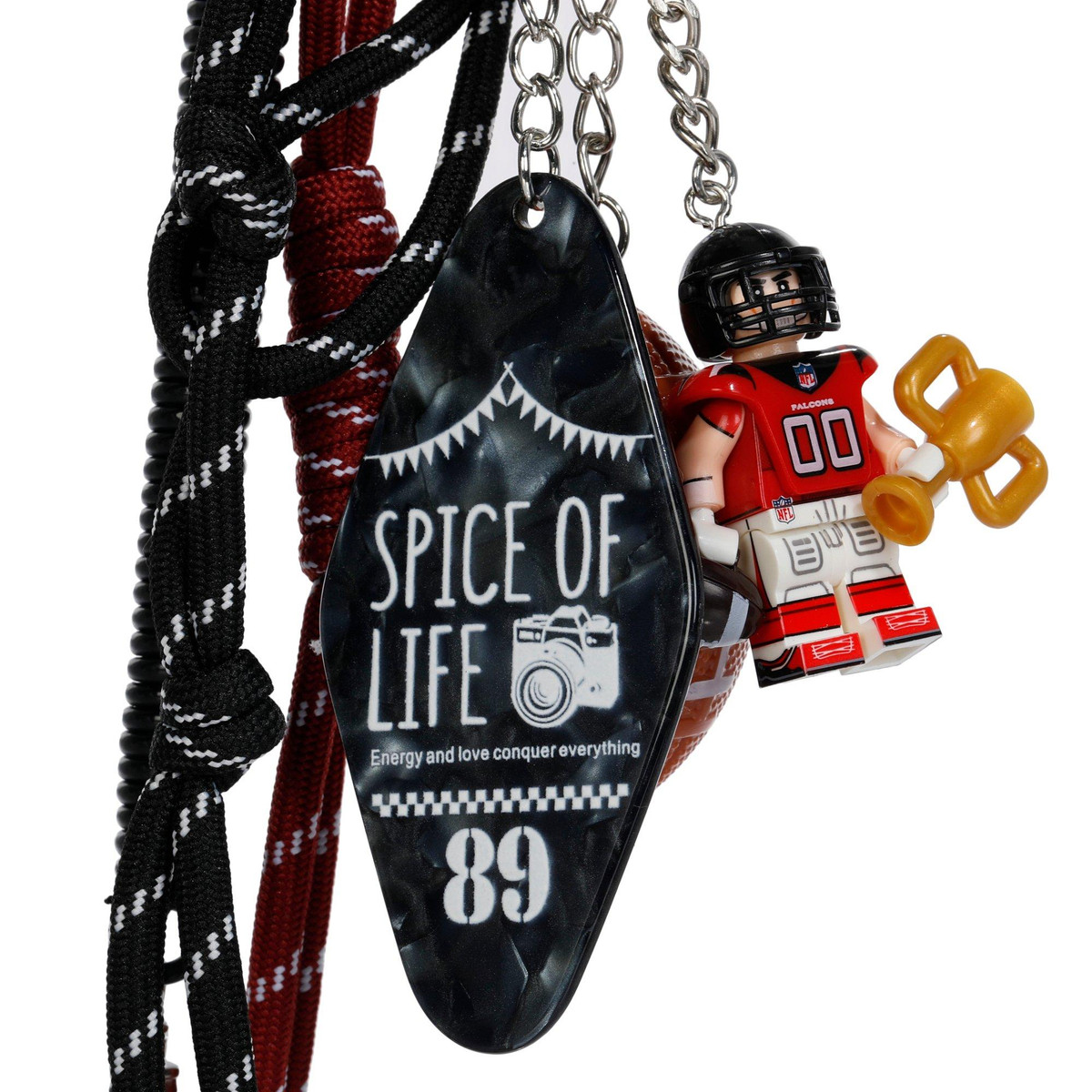 Bag charm set features a black football player Lego, garnet accent, football charm, and retro flair on a star-shaped carabiner. Designed in the USA, this pink and black combo adds sporty style to book bags, Bogg Bags, or any purse. A fun way to show off your personality with four unique charms and shoelace accents.