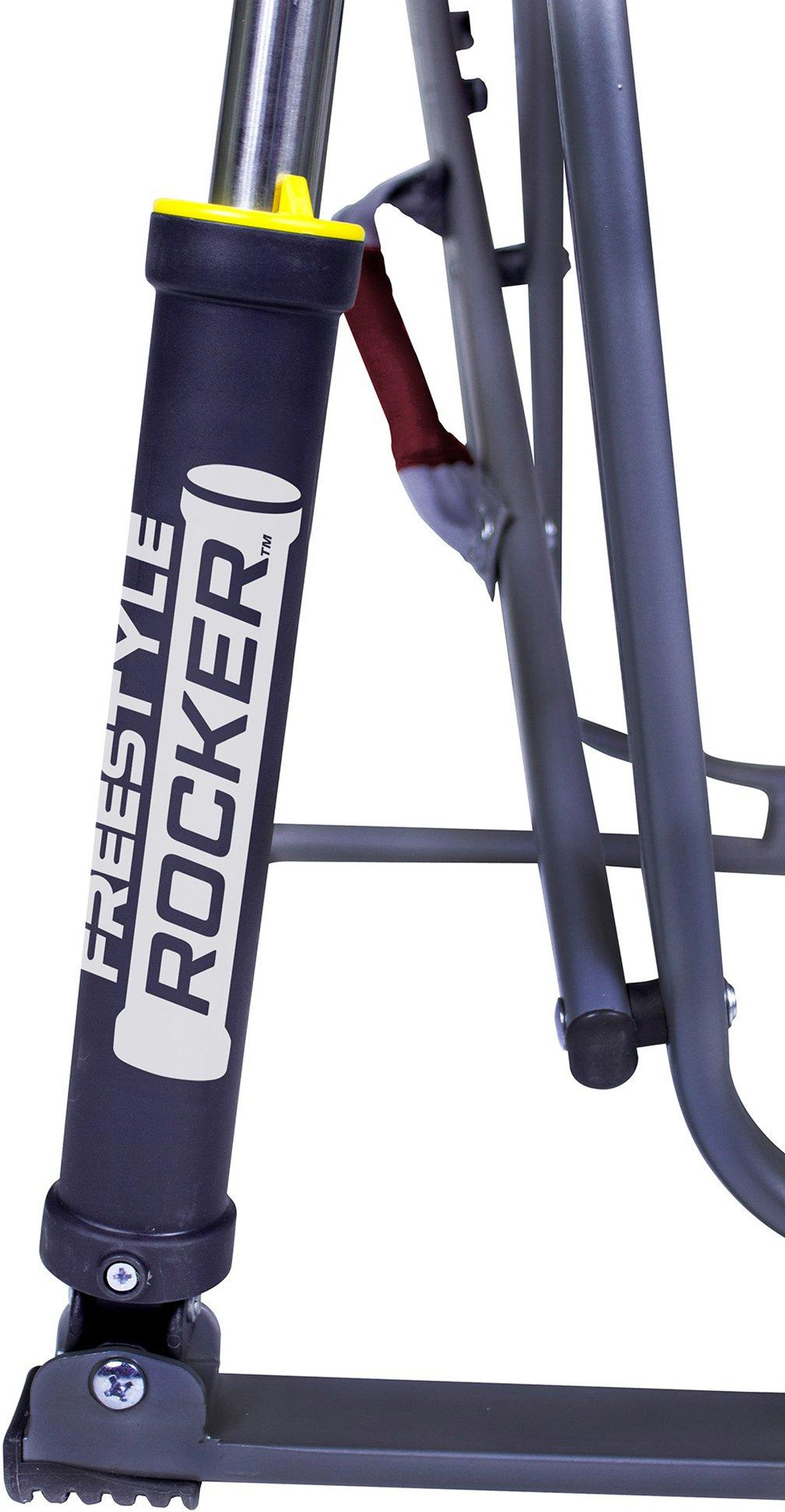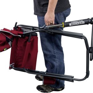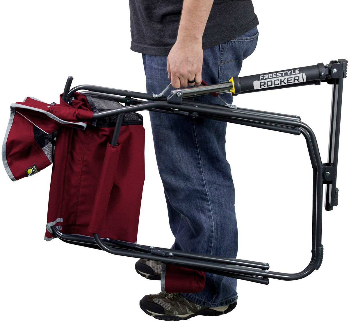 This Freestyle Rocker chair by GCI features spring action rocking technology, folds flat for storage, convenient carry handle, beverage holder, mesh backrest, and carry bag. Made with powder-coated steel frame and polyester fabric. Weight capacity 250 lbs. Measures 24”L x 25”W x 34.8”H open and 25”L x 4.9”W x 34.8”H folded. Seat height is 19”. Weighs 11.8 lbs.