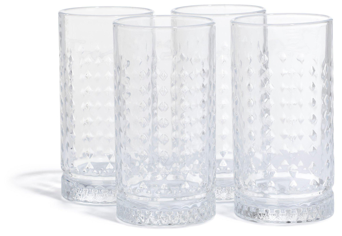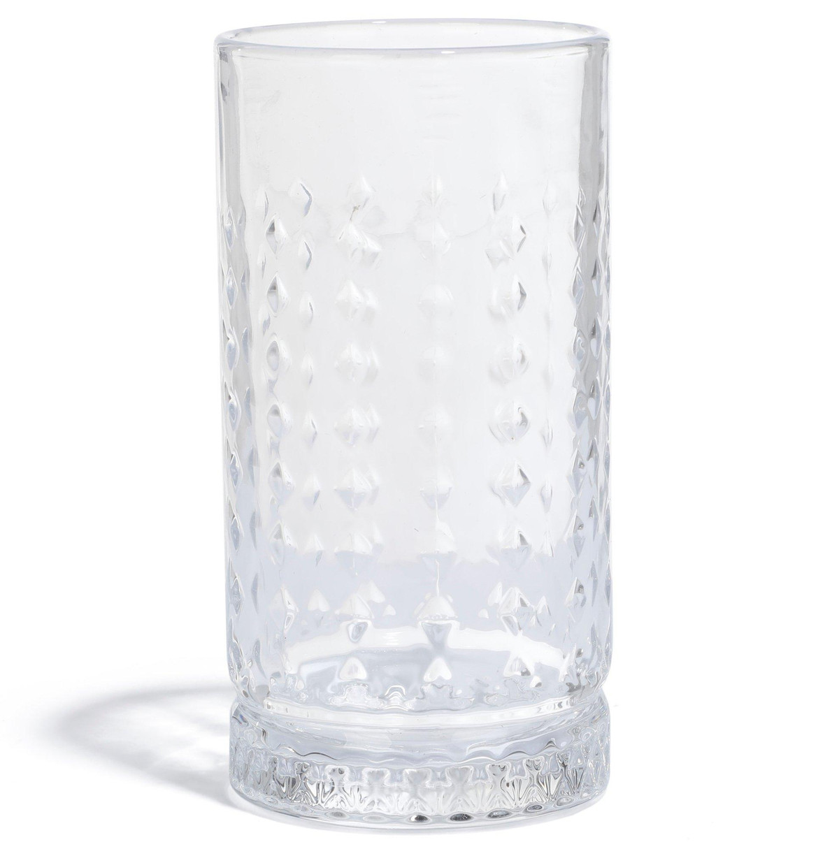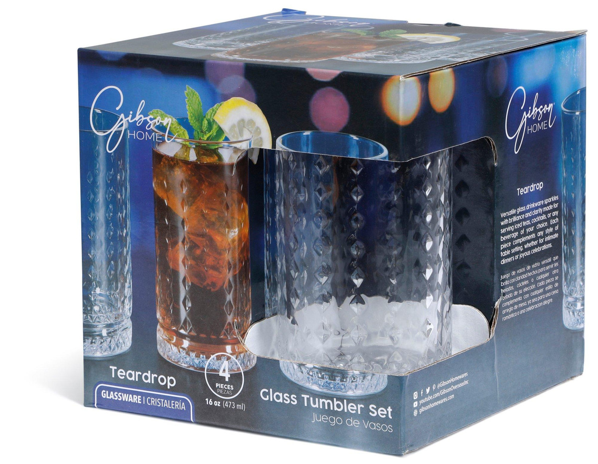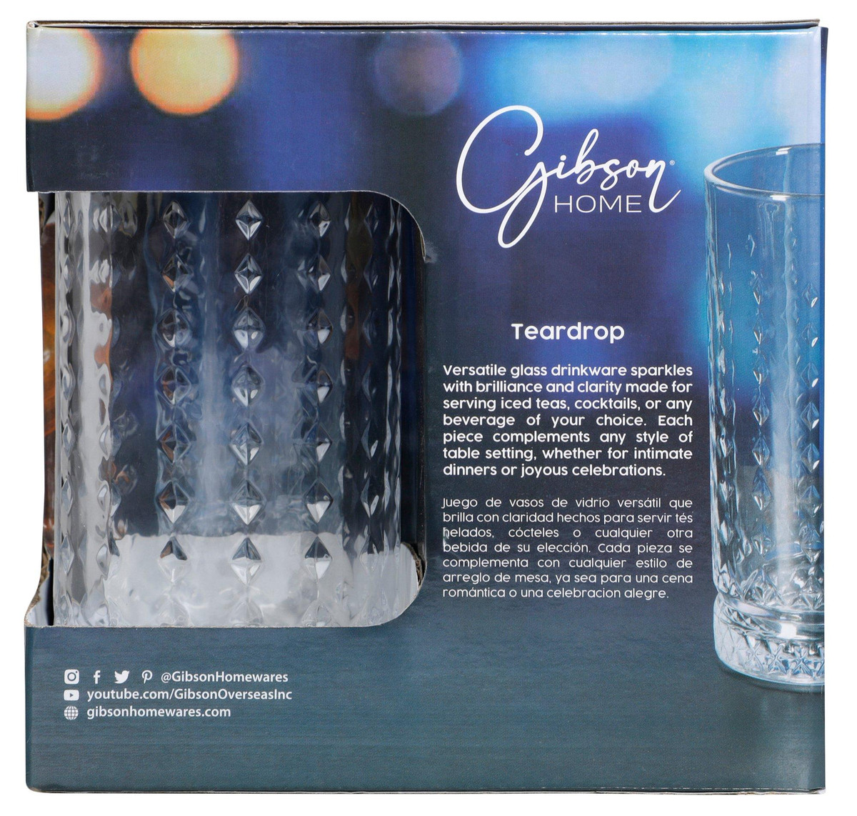 This 16 Ounce drinkware set from Gibson Home is designed with a teardrop shaped embossed exterior that sparkles with brilliance and clarity. Perfect for serving iced teas, cocktails, or any beverage of your choice, each piece complements any style of table setting. Whether you are celebrating with friends or enjoying a casual drink, this set will add a special touch to the occasion. Durable glass construction is dishwasher safe for easy cleanup.