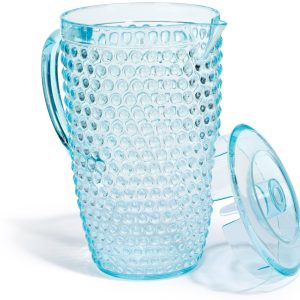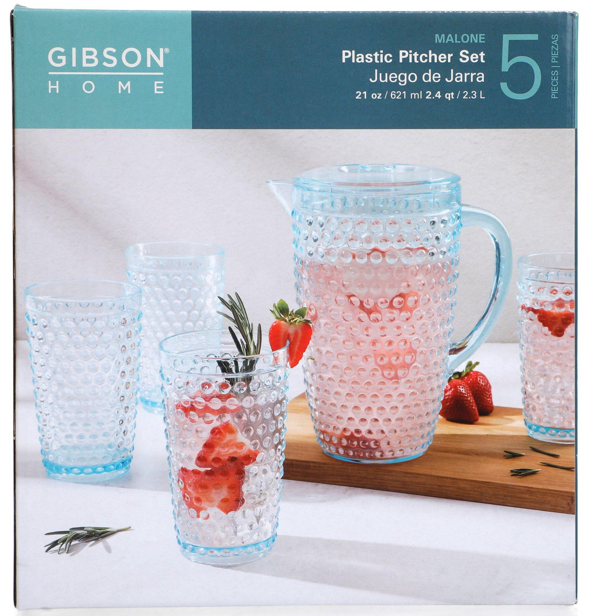 The Gibson Home 5 Pc Teal Embossed Pitcher Set is perfect for adding a touch of vintage charm to any table setting. The set comes with a pitcher and four matching drinking glasses. The embossed detail and vibrant sky-blue color create a beautiful and eye-catching appeal that will enhance any dining experience, whether it’s indoor or outdoor. It is made of a durable plastic that is easy to transport from the kitchen to the table.