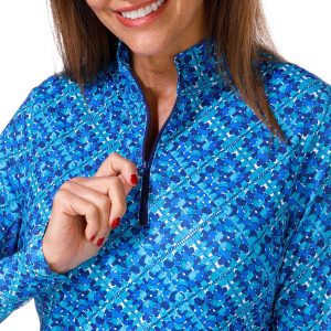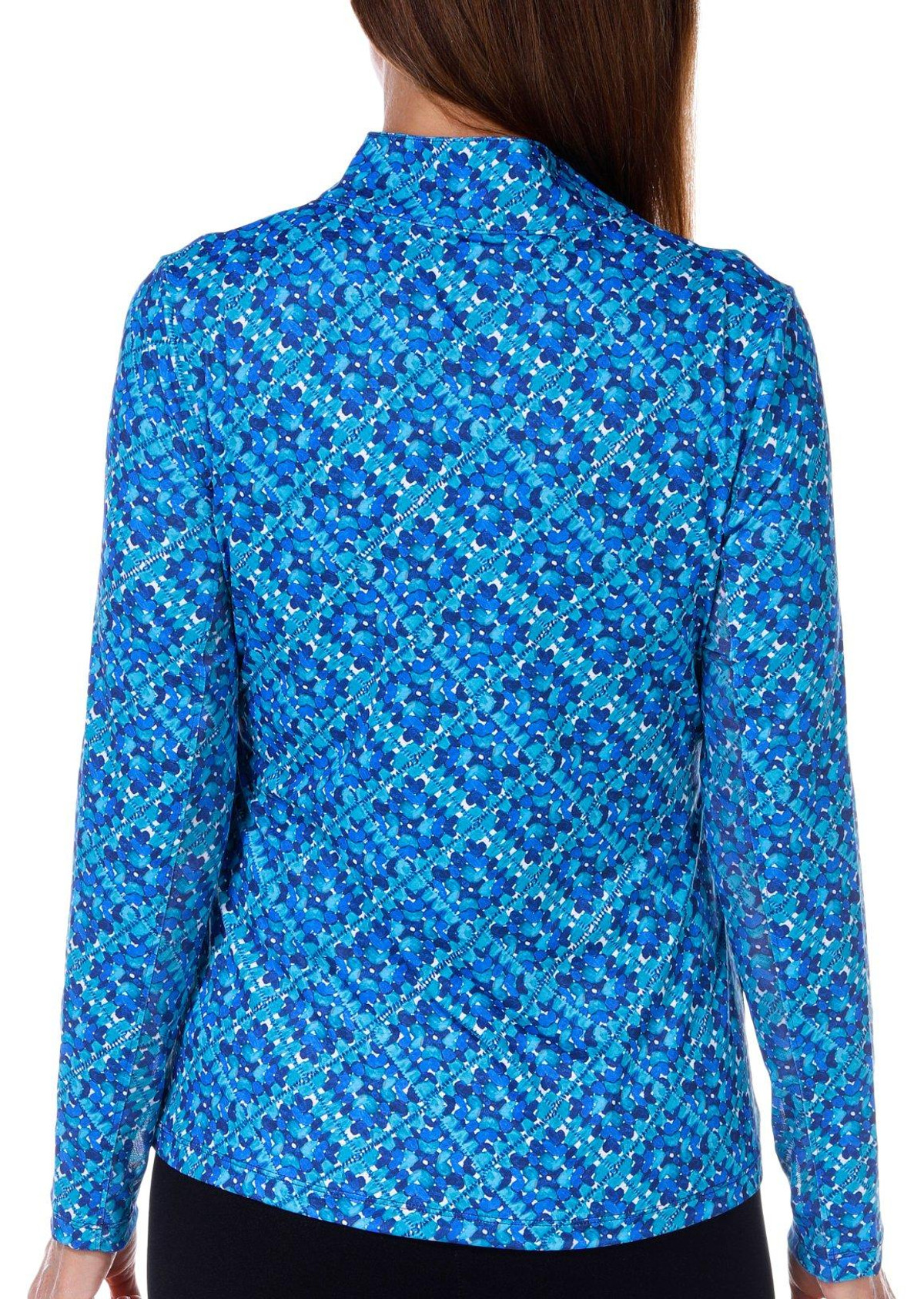 This women’s active Kate mock top features a vibrant print with long sleeves and a zip placket neckline. Designed for performance it offers moisture wicking, quick dry, fabric flatlock stitching, and four way stretch for comfort and ease during any activity. Fabrication 88% polyester, 12% spandex