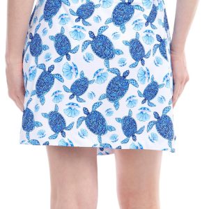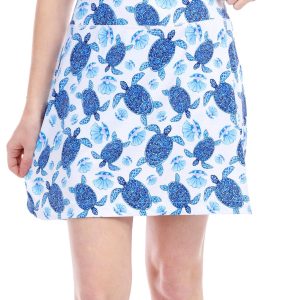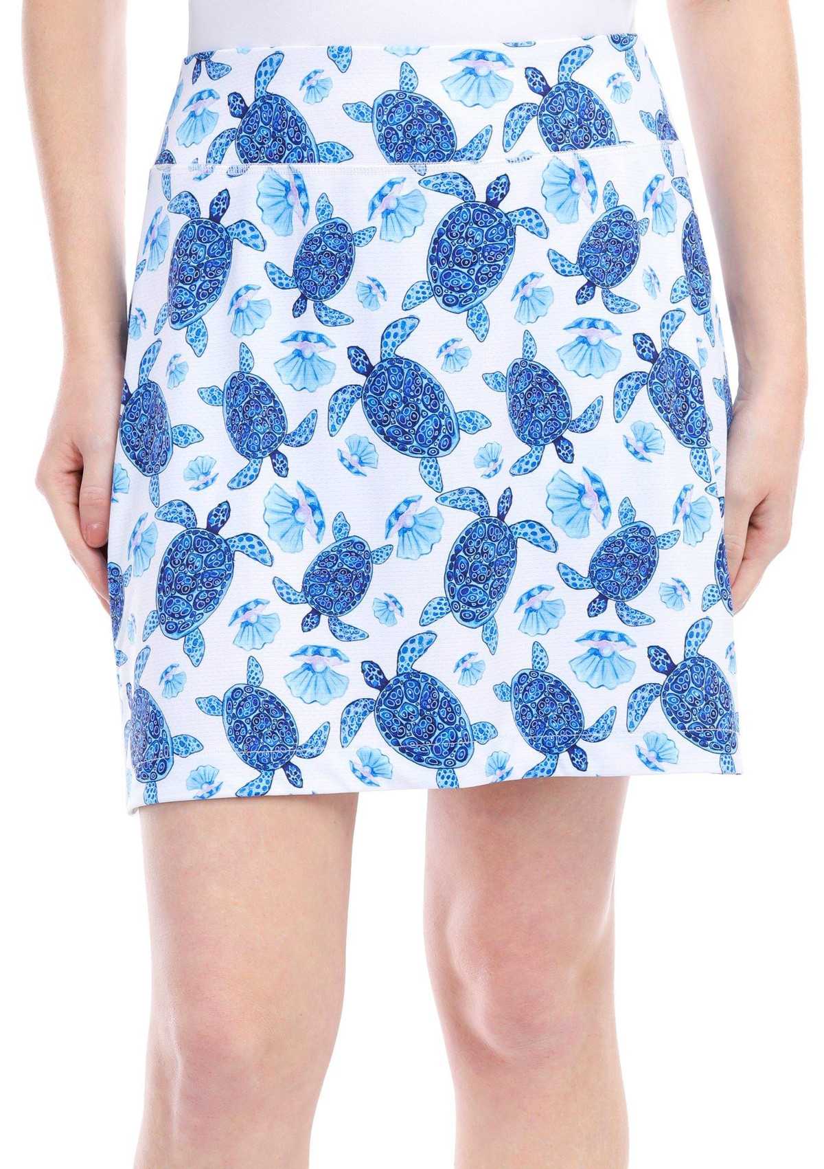 This active skort, made from a soft fabric blend, combines style and comfort. The vibrant turtle print adds a fun touch, while the moisture-wicking fabric ensures you stay cool and dry during workouts or outdoor activities. Perfect for both active wear and casual outings. Fabrication is 88% polyester and 12% spandex. Outseam measures approximately 16 in.