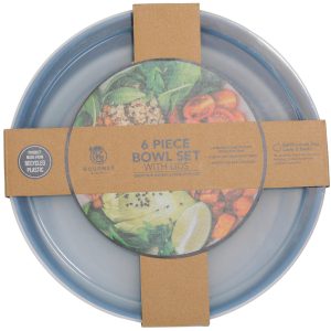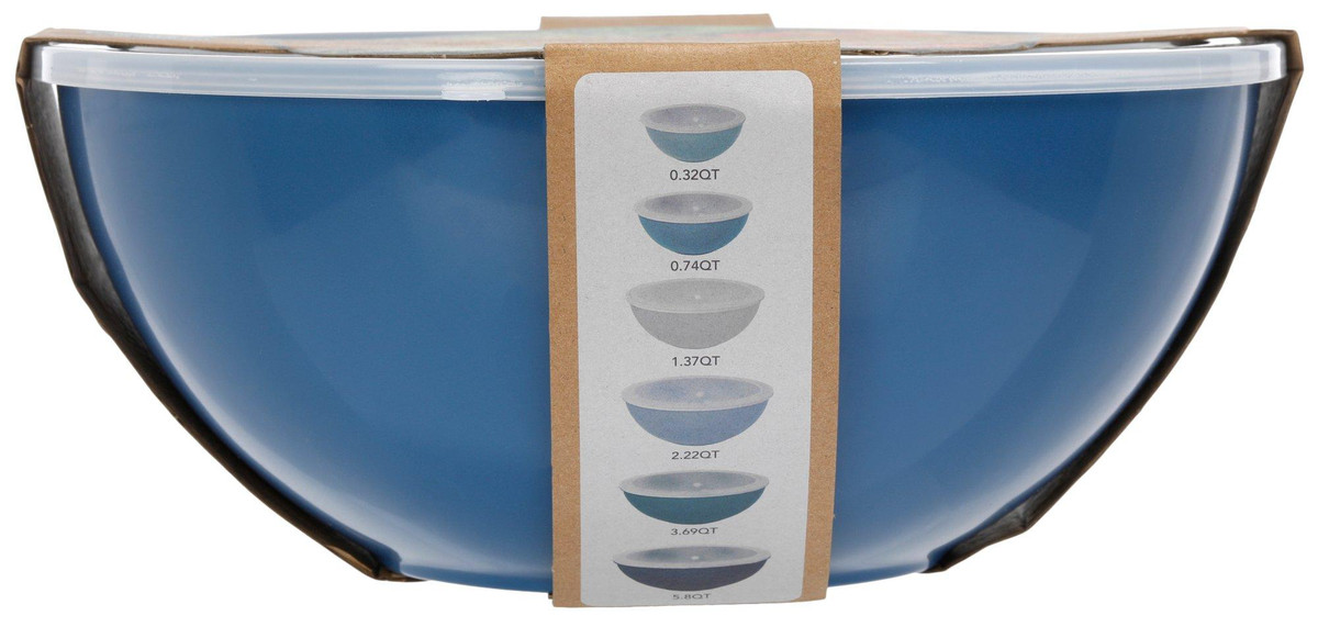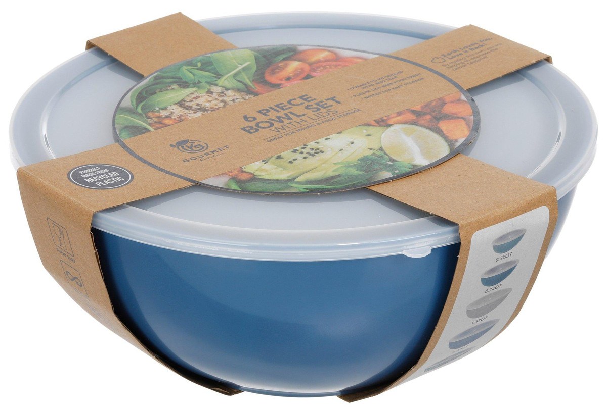 This set of 6 bowls with included lids is made from durable recycled plastic and designed to keep food fresh. The bowls nest for easy, space saving storage, making them ideal for meal prep, leftovers, and everyday use. A practical, eco friendly addition to any kitchen. Includes .32 QT bowl, .74 QT bowl, 1.37 QT bowl, 2.22 QT bowl, 3.69 QT bowl, and 5.8 QT bowl.