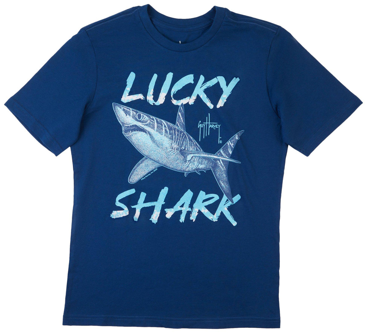 Channel ocean energy with the Guy Harvey Big Boys Lucky Shark Short Sleeve T-Shirt, featuring a bold shark graphic and Lucky Shark text on the front of a dark blue background. Crafted for comfort and durability. Ideal for school, casual outings, and outdoor play.