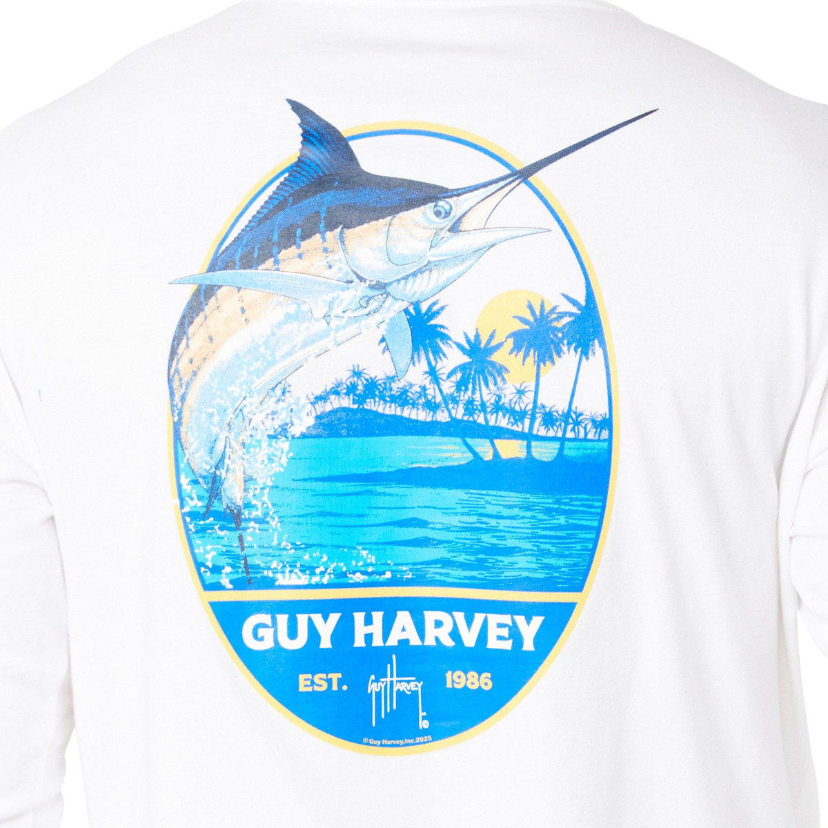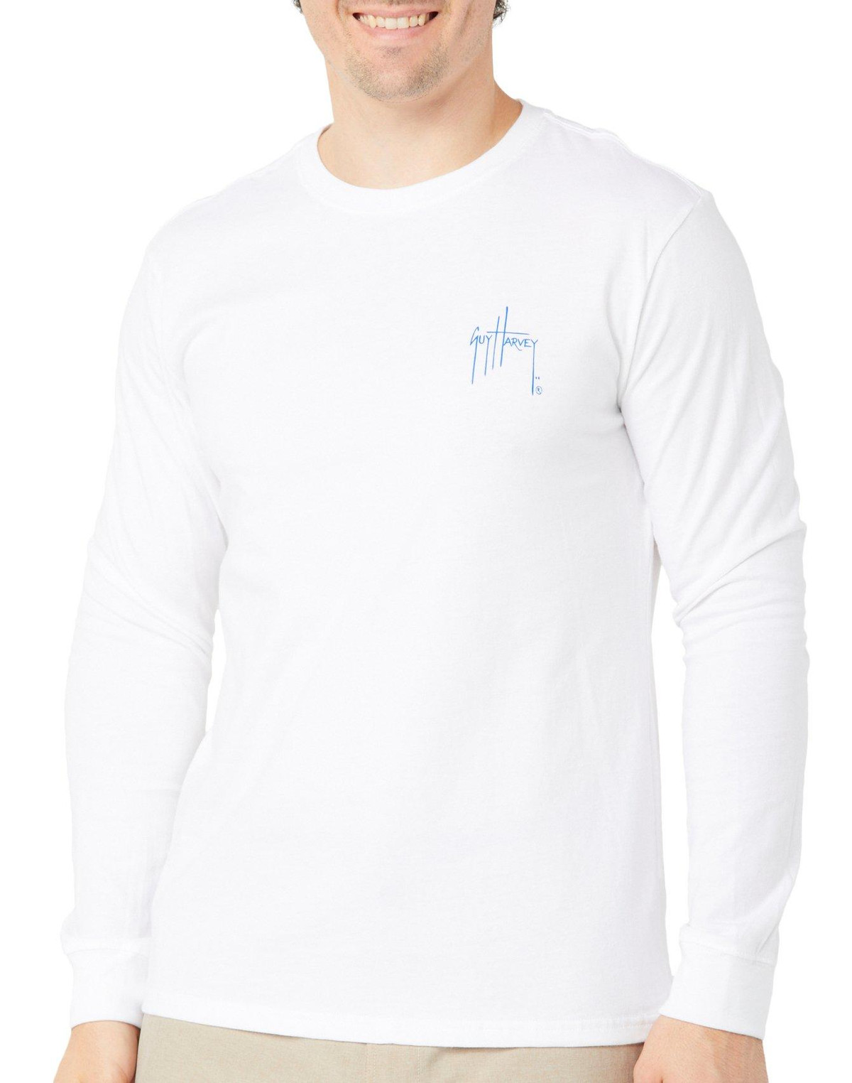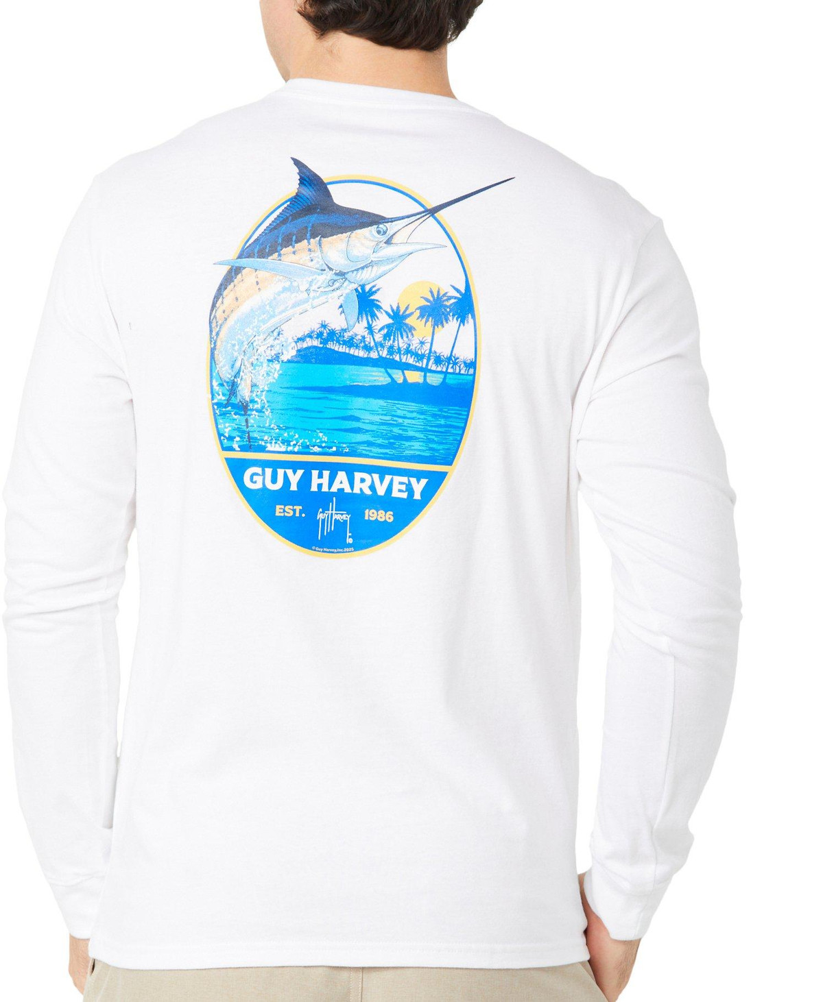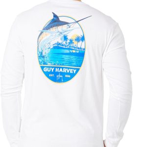 This men’s long sleeve tee features a graphic on the back with a coastal Hawaiian scene and fish. Made with soft fabric for casual comfort and relaxed style. Fabrication is 100% cotton.