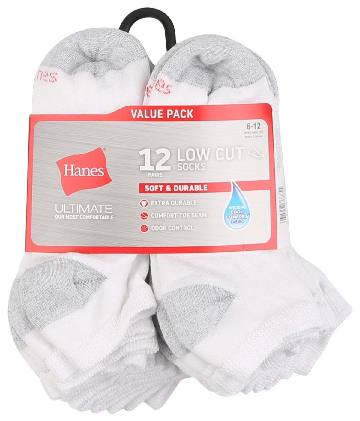 These 12-pair Ultimate Low Cut Socks come in a colorblock design on a cotton blend knit fabrication. Socks are extra durable with reinforced toe and heel, odor control to help fight stinky feet, wicking to help feet stay cool and dry, and a comfort toe seam. Fits mens shoe size 6-12, sock size 10-13. Contains 12 pairs low cut socks. Fabrication is 46% cotton, 45% polyester, 7% rayon, 1% spandex, and 1% nylon.