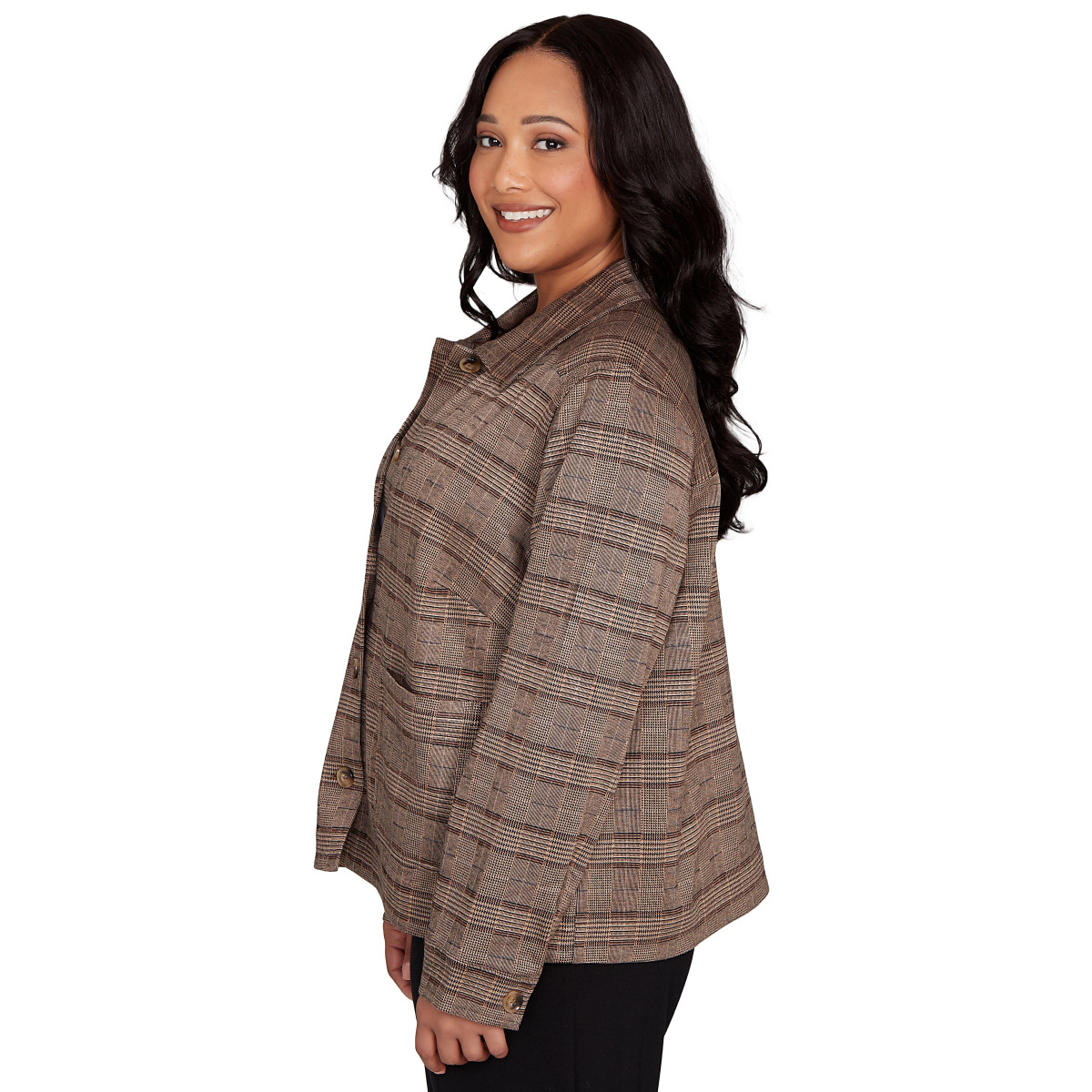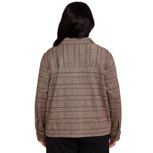 Embrace cozy fall style with this Hearts Of Palm plaid jacket. Featuring long sleeves, button-down styling, two front pockets, and a spread collar, this versatile layer blends comfort and polish. Perfect for workdays or weekend outings. The jacket length measures 26 in. Fabrication 75% viscose, 22% polyester, 3% spandex.