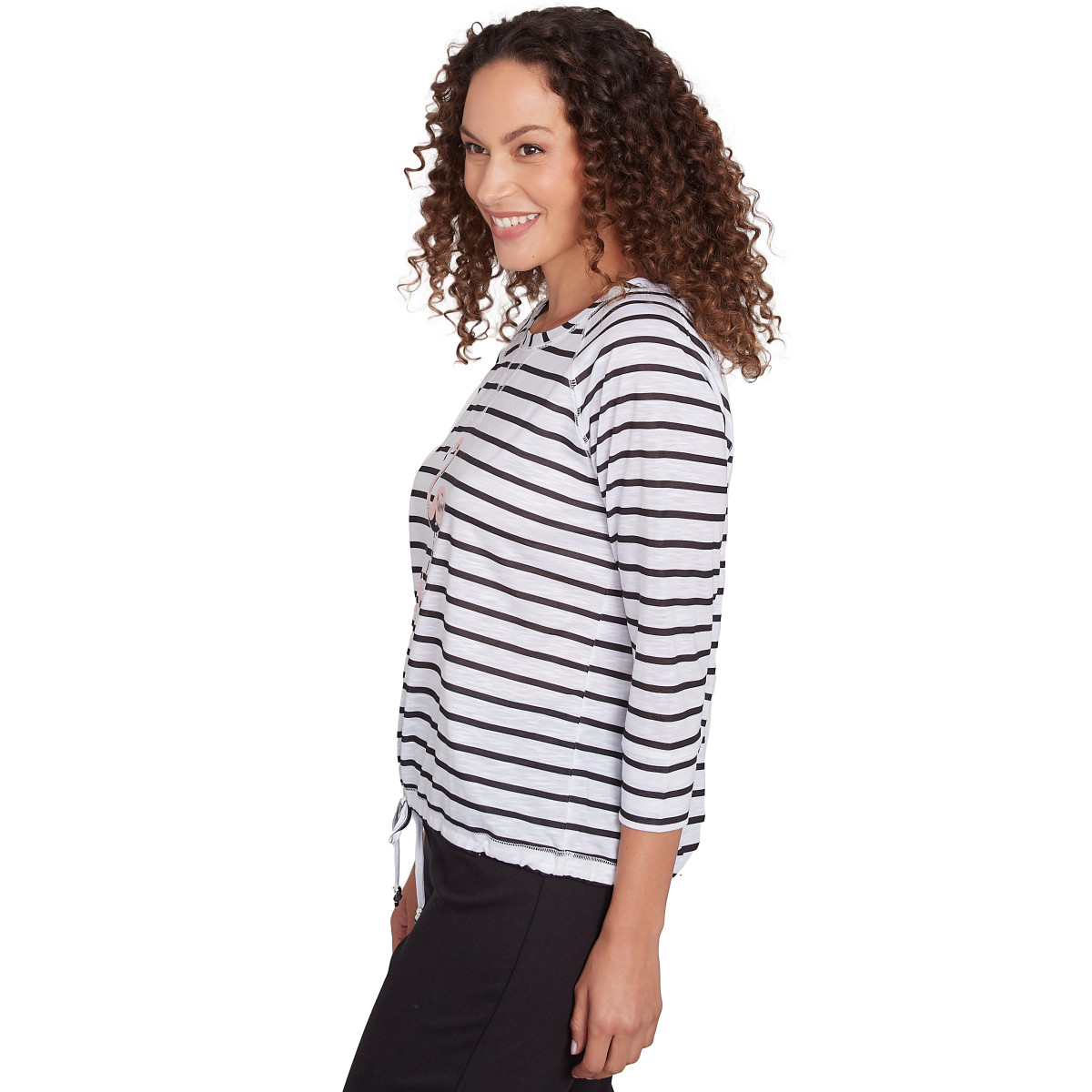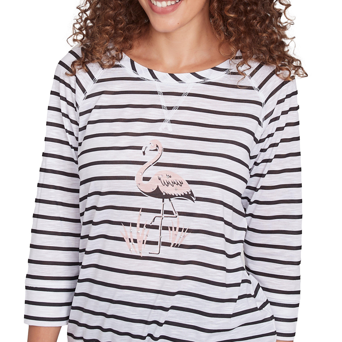 Embrace your inner fashionista with this statement-making Womens Hearts of Pam In Black & White tee. The bold flamingo print and eye-catching striped pattern instantly elevate any outfit, while the soft, drapey fabric and 3/4 sleeves create a figure-flattering silhouette.