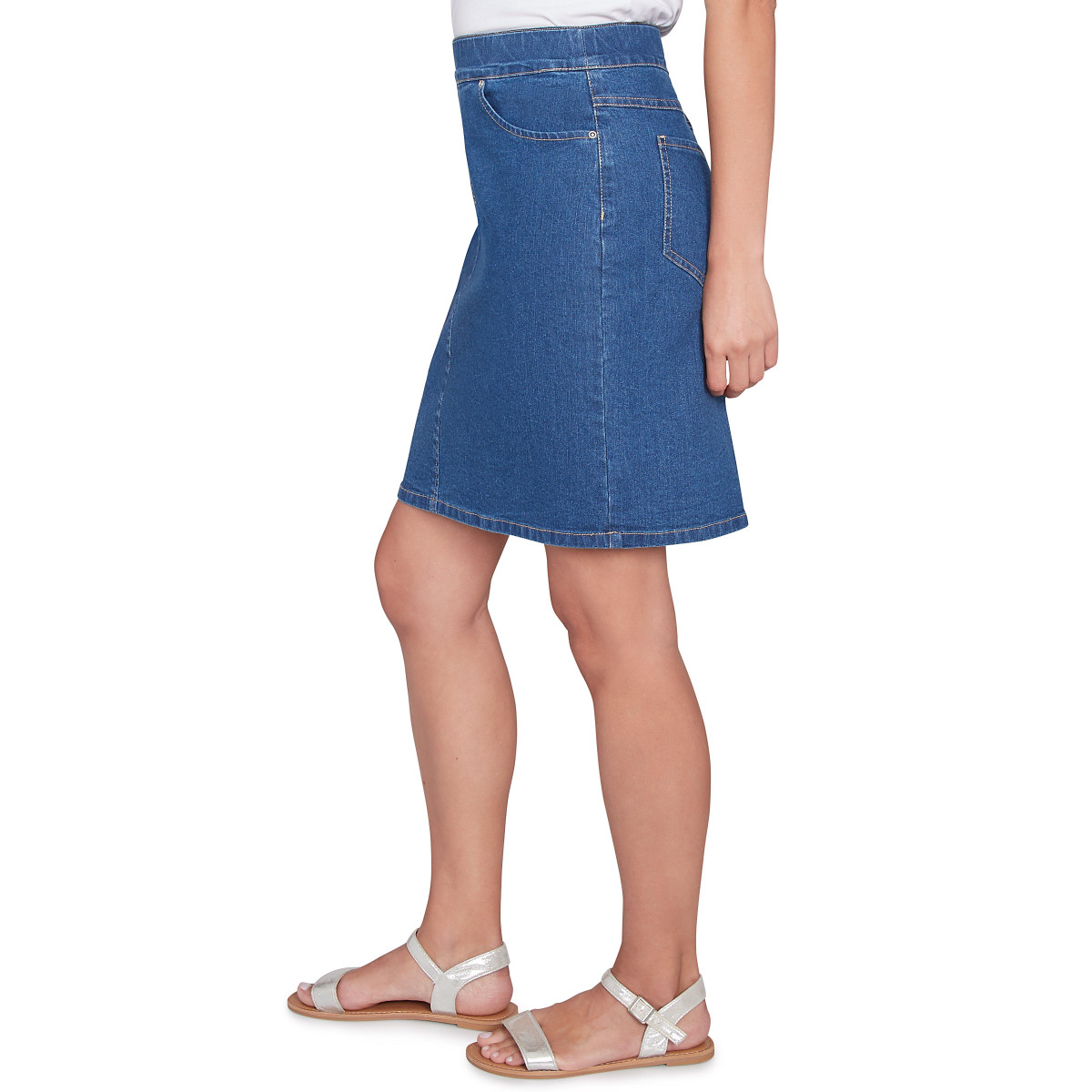 Slip into this Womens Hearts of Palm Anchors Away indigo stretch denim skirt and experience everyday elegance. The pull-on waistband offers easy, on-the-go convenience, while the stretchy denim fabric conforms to your curves for a flawless, figure-flattering fit. Features faux fly, stretchy denim fabric and pull on waistband.