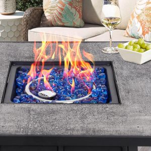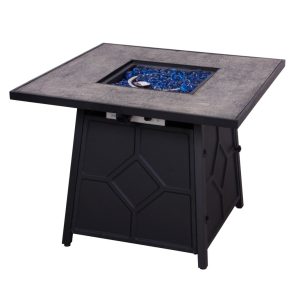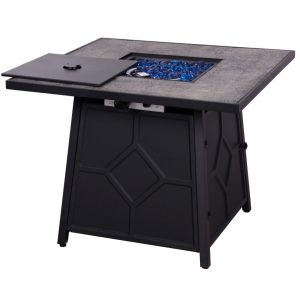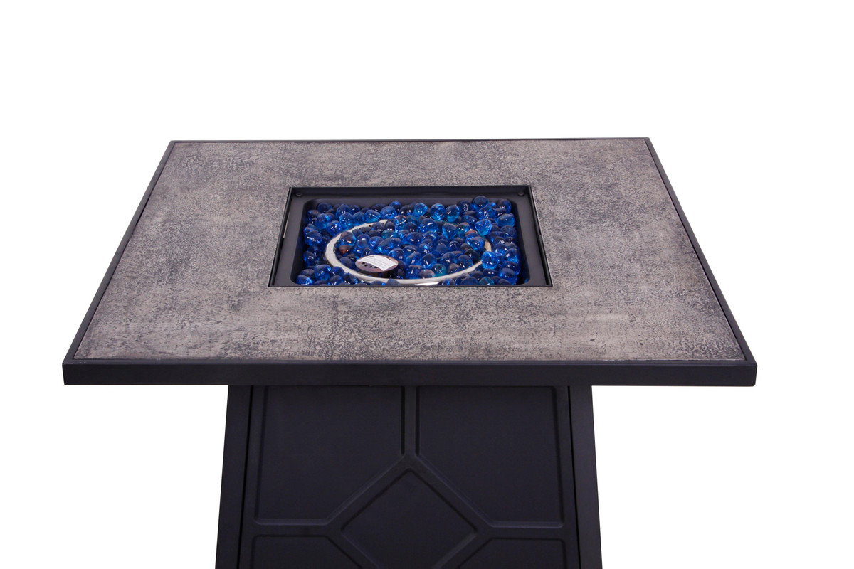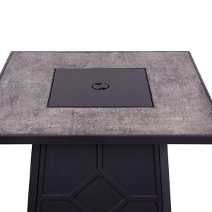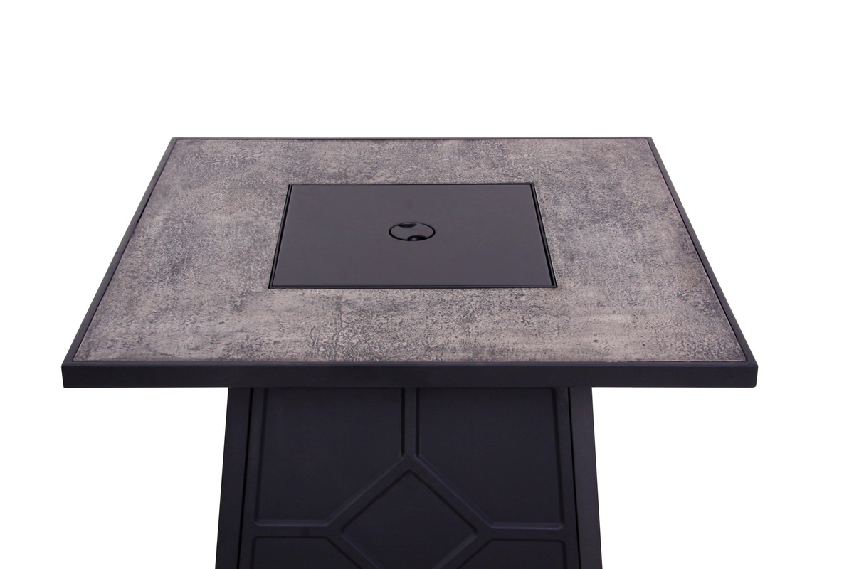 Welcome to the Heat Maxx 40000 BTU 32 in. Square Propane Firepit! Its unique pyramidal design and large faux stone tabletop make it multifunctional, easily converting to an outdoor table with the included cover. The ceramic stone print tabletop and stamped powder-coated steel sidewalls ensure durability. Featuring push/turn piezo ignition and space for a 20 lb. propane tank (not included), it also comes with glass bezels and a PVC weatherproof cover. Measures 32 in. x 32 in. x 25 in. H.