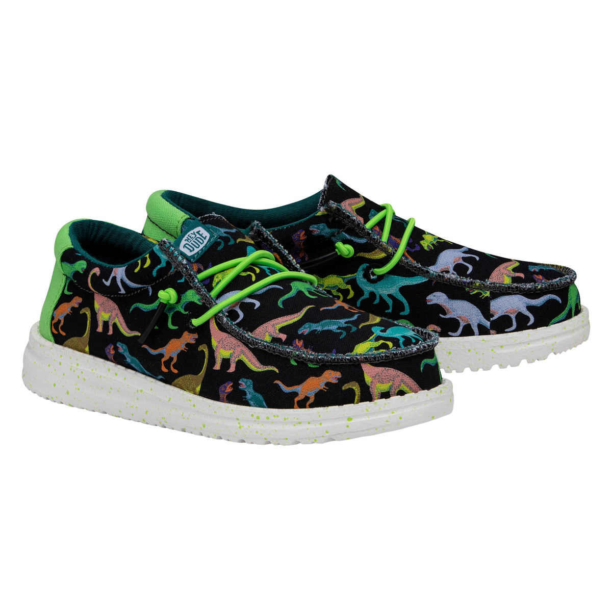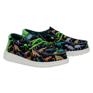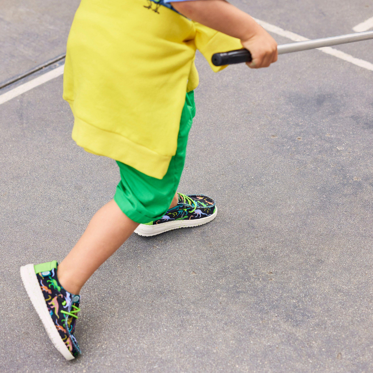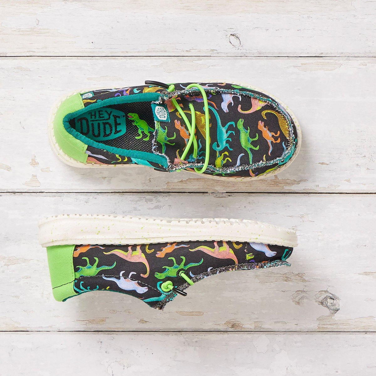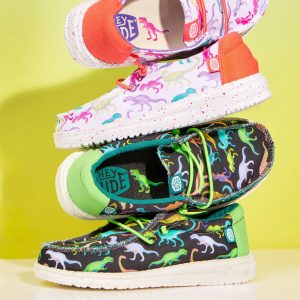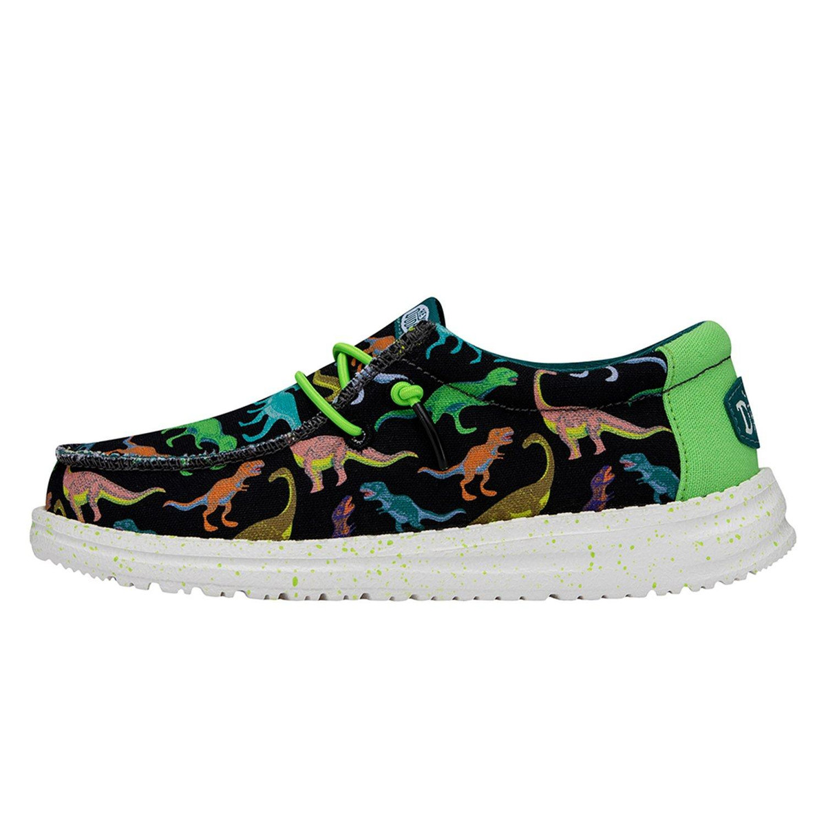 The HEYDUDE Wally Dino shoes, designed to bring comfort and style to your little one’s adventures. These adorable shoes feature a playful dino themed design that’s bound to capture the imagination of your toddler. The canvas upper is soft and lightweight, ensuring breathability and easy movement. With the signature Flex & Fold technology by HEYDUDE, these shoes provide unparalleled flexibility and support.
