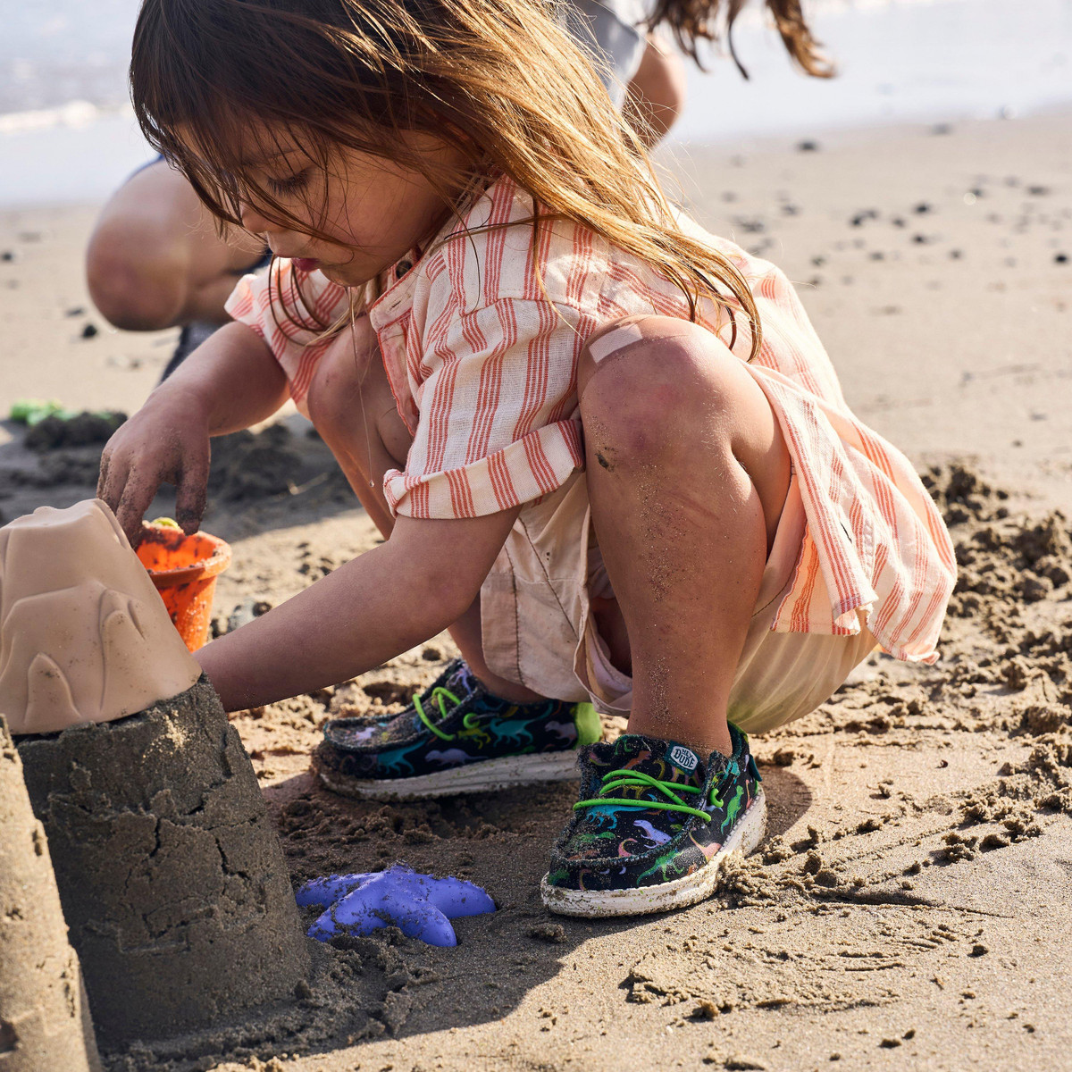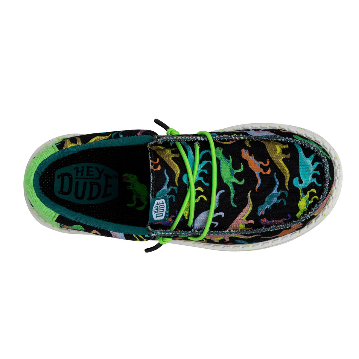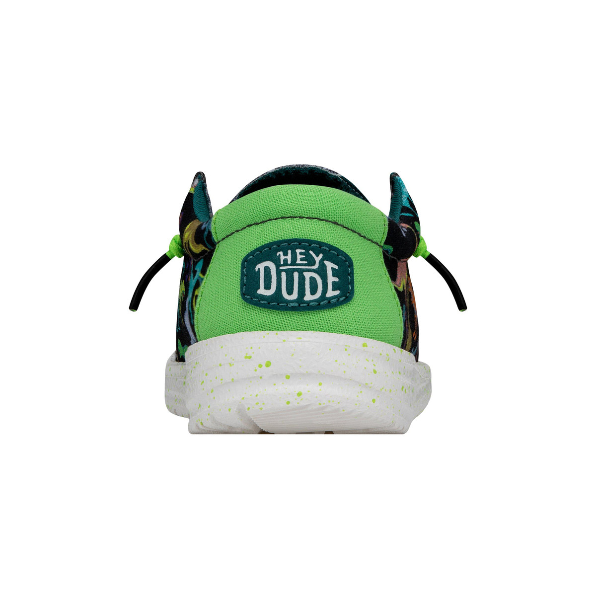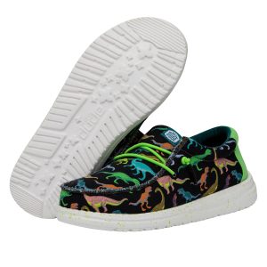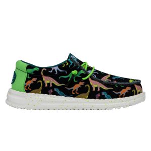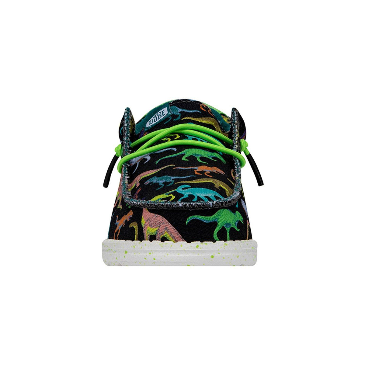 The HEYDUDE Wally Dino shoes, designed to bring comfort and style to your little one’s adventures. These adorable shoes feature a playful dino themed design that’s bound to capture the imagination of your toddler. The canvas upper is soft and lightweight, ensuring breathability and easy movement. With the signature Flex & Fold technology by HEYDUDE, these shoes provide unparalleled flexibility and support.
