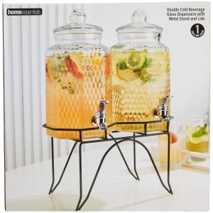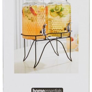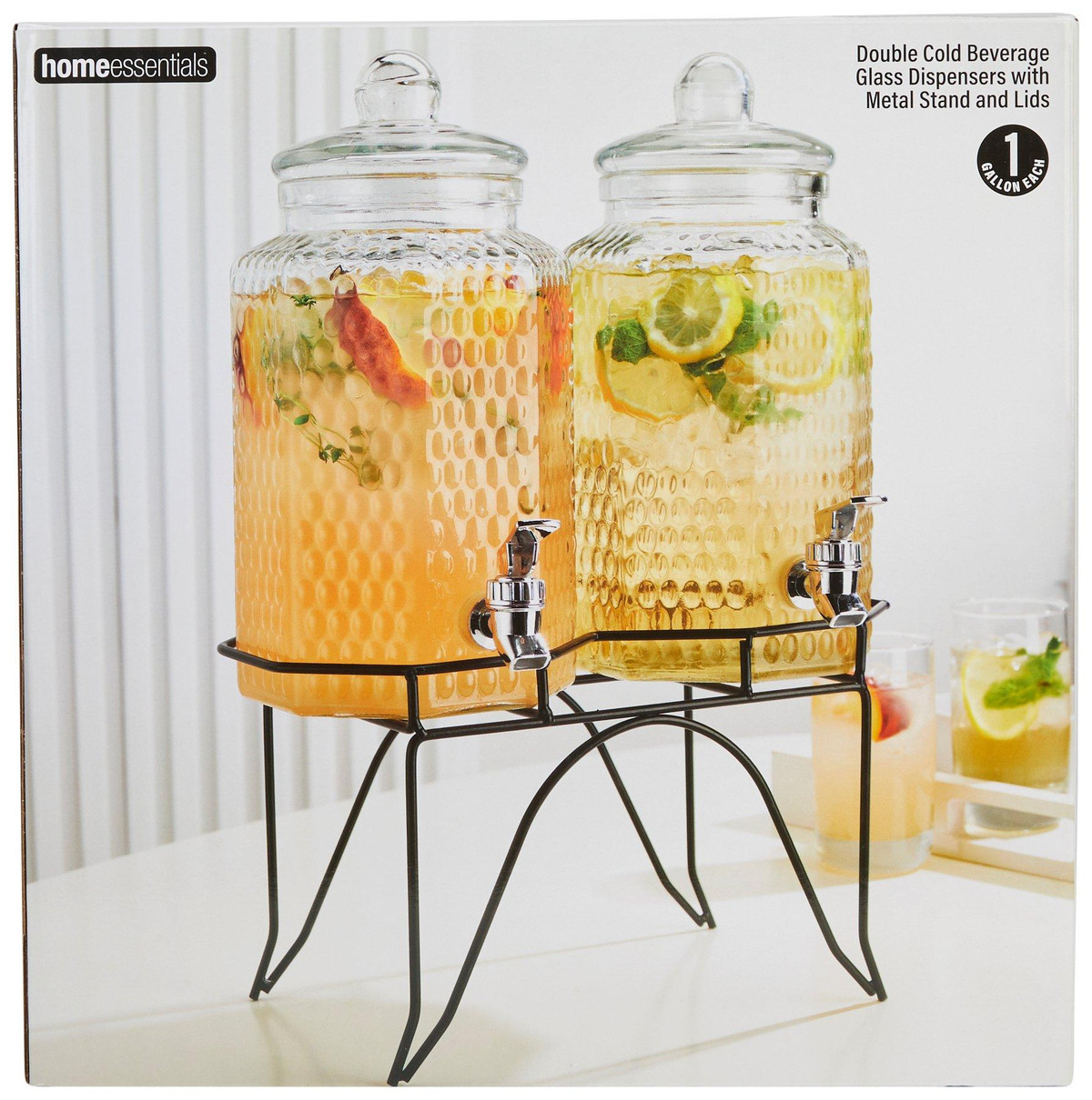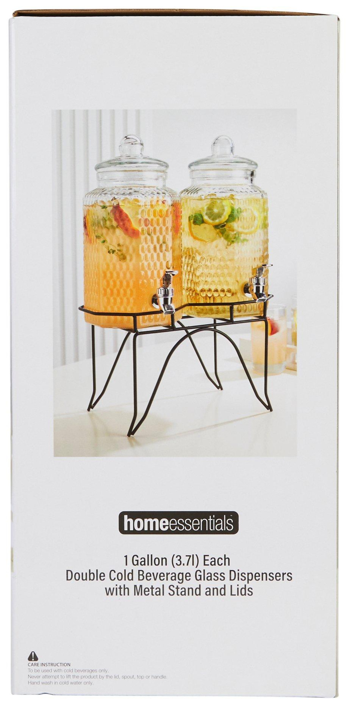 Keep drinks cold and style dialed up with the Home Essentials Dual 1 Gallon Beverage Dispenser Set. Crafted from hammered-look pressed glass, each jug brings artisanal texture to your setup while resting in a sturdy metal stand for easy serving. Includes two matching lids for freshness and flair. Perfect for tea, lemonade, or infused water, it is the ultimate drink station for gatherings, parties, or daily hydration with a touch of elegance. Serve smart. Sip in style. Let it flow.
