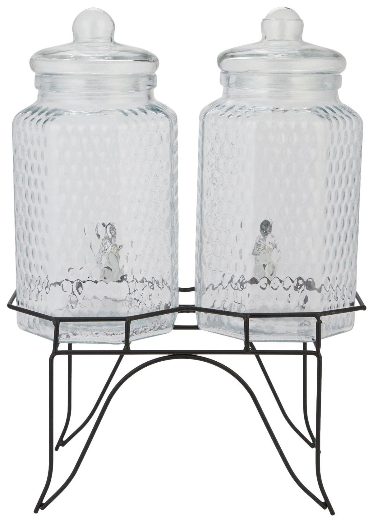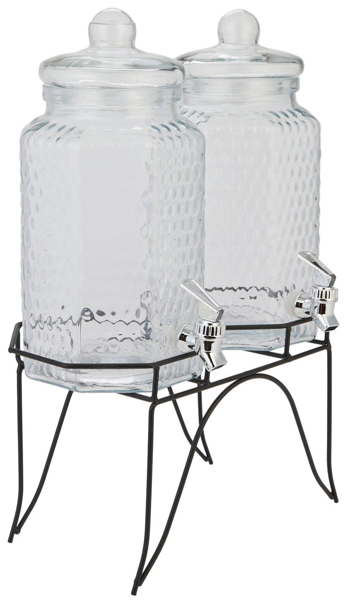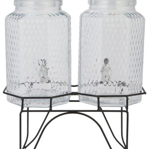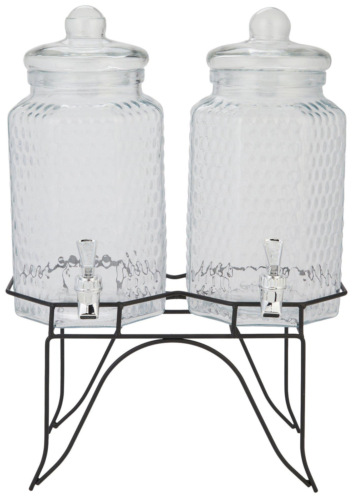 Keep drinks cold and style dialed up with the Home Essentials Dual 1 Gallon Beverage Dispenser Set. Crafted from hammered-look pressed glass, each jug brings artisanal texture to your setup while resting in a sturdy metal stand for easy serving. Includes two matching lids for freshness and flair. Perfect for tea, lemonade, or infused water, it is the ultimate drink station for gatherings, parties, or daily hydration with a touch of elegance. Serve smart. Sip in style. Let it flow.