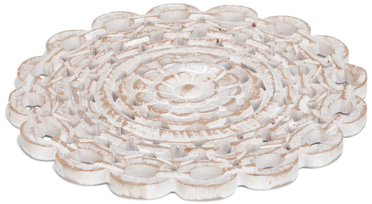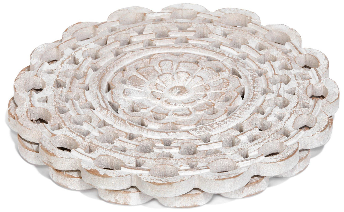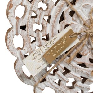Protect your surfaces in style with this 2 pk Round Wood Trivets, expertly crafted from 100% natural wood. Designed to withstand heat, each trivet provides a reliable barrier between hot cookware and your countertops or table. Their warm, rustic finish adds an organic touch to any kitchen or dining space. Perfect for daily use or entertaining, these versatile trivets blend functionality with timeless charm. Fabrication is 100% wood. Each trivet measures approximately 9 in round.