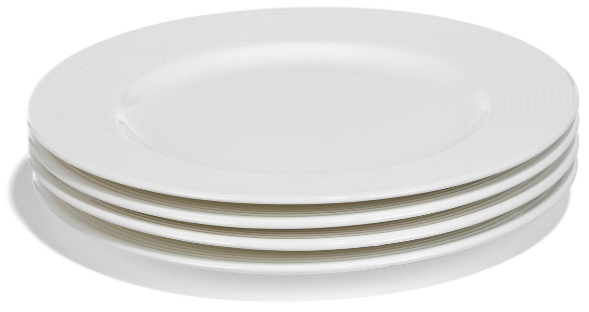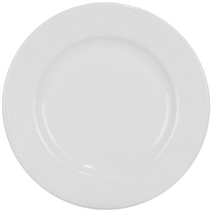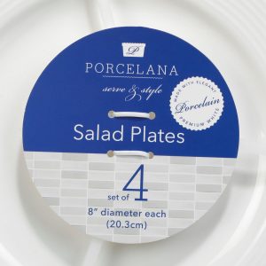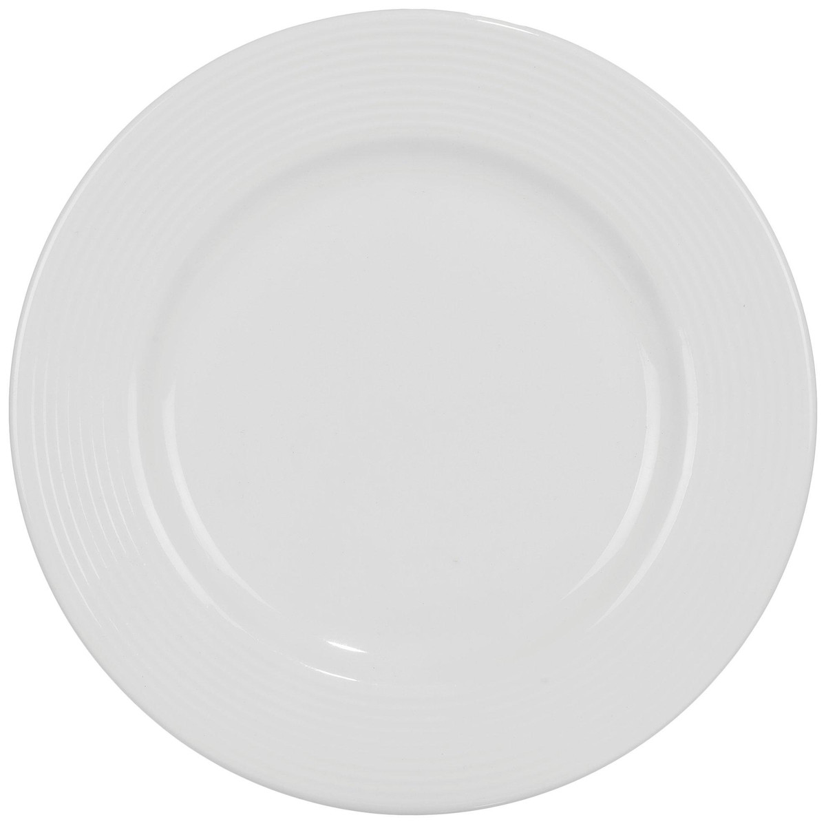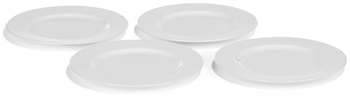 Elevate your table setting with this 4 pack of White Ceramic Salad Plates, designed for both everyday meals and special occasions. Each 8-inch plate features a clean, classic look with five subtle embossed lines along the rim, adding a touch of texture and elegance. Crafted from durable ceramic, they offer timeless style and reliable performance. Perfect for serving salads, appetizers, or desserts with understated sophistication. Measures approximately 8 in round.