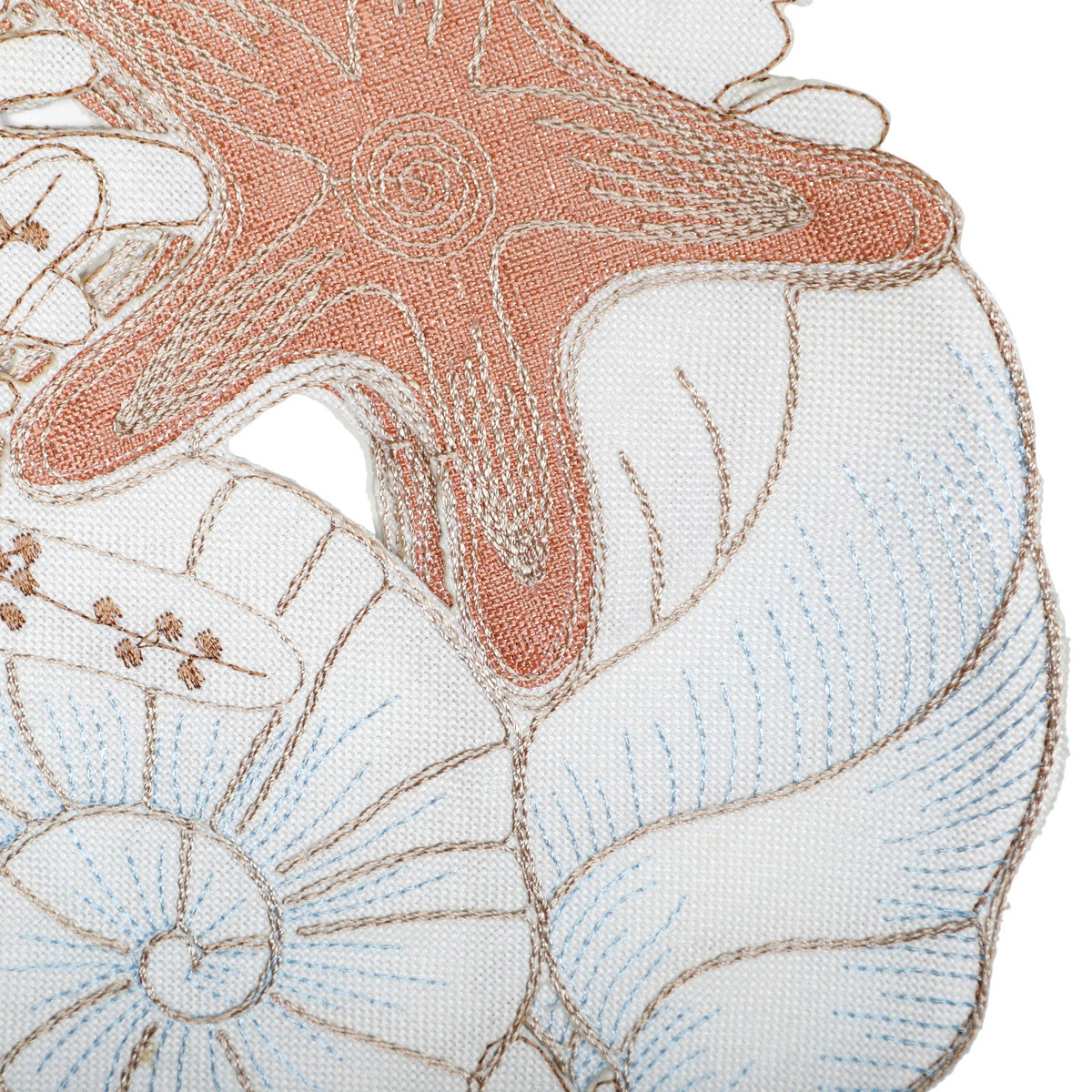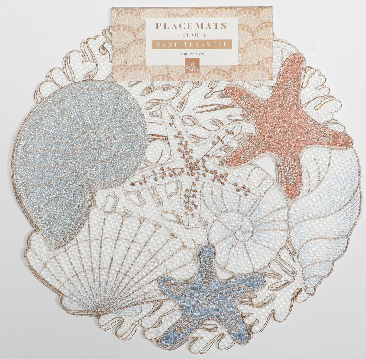 Add coastal decor style to your table with a 4-pack of round placemats featuring a sand treasures design. Crafted from 100% polyester, they blend seaside charm with everyday function. Perfect for casual dining or relaxed entertaining, these placemats are durable, easy to clean, and built to last. Fabrication is 100% polyester. Measures 15 in round.