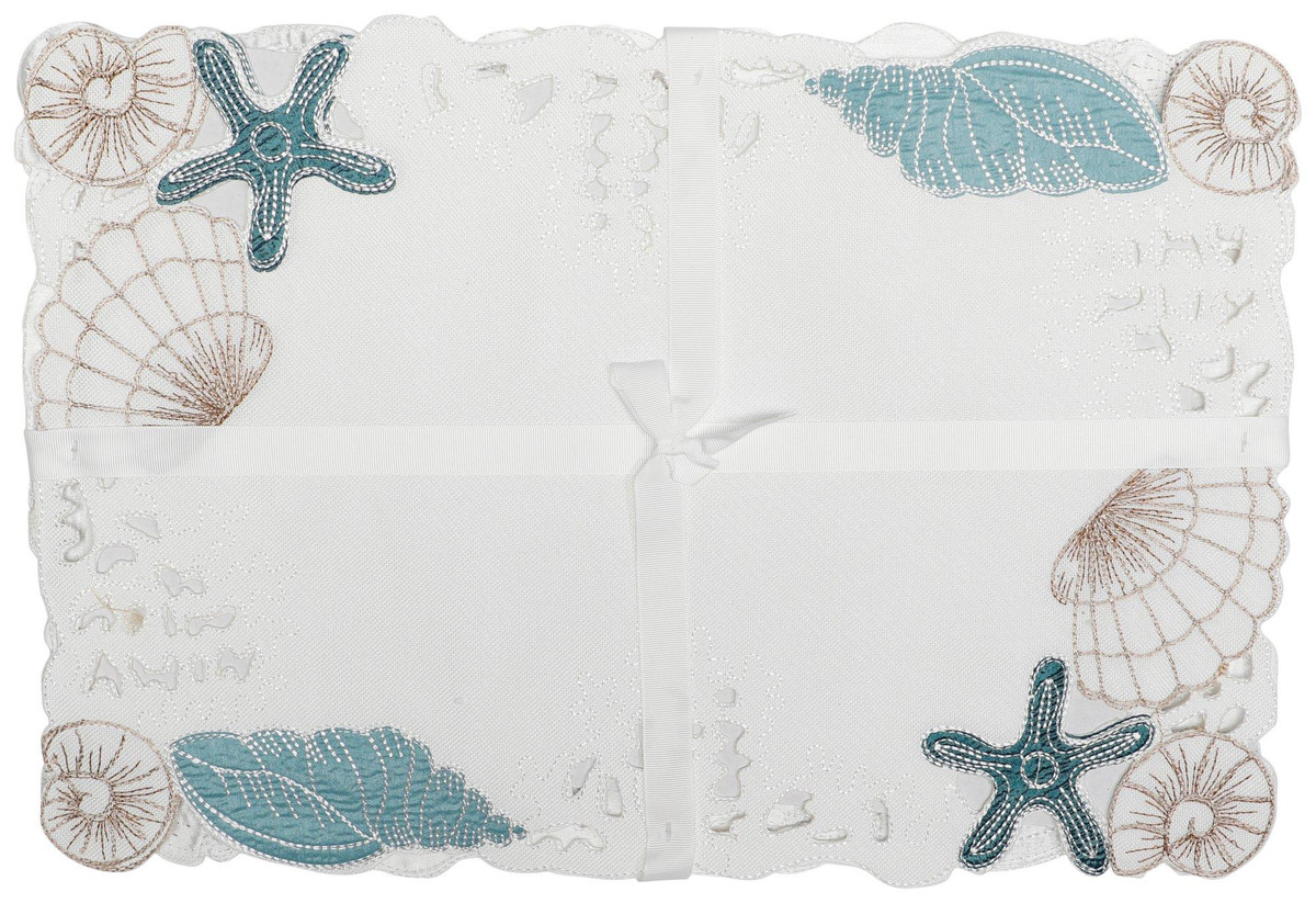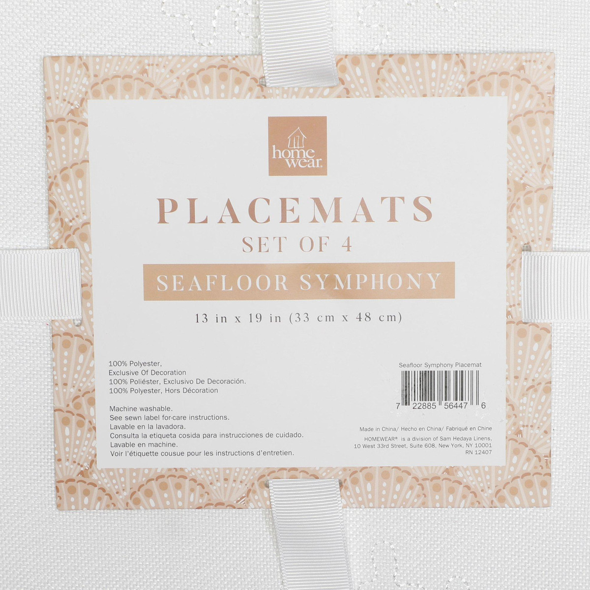 Add coastal decor style to your table with a 4-pack of rectangular placemats featuring a seafloor design. Crafted from 100% polyester, they blend seaside charm with everyday function. Perfect for casual dining or relaxed entertaining, these placemats are durable, easy to clean, and built to last. Fabrication is 100% polyester. Measures approximately 13 in x 19 in.