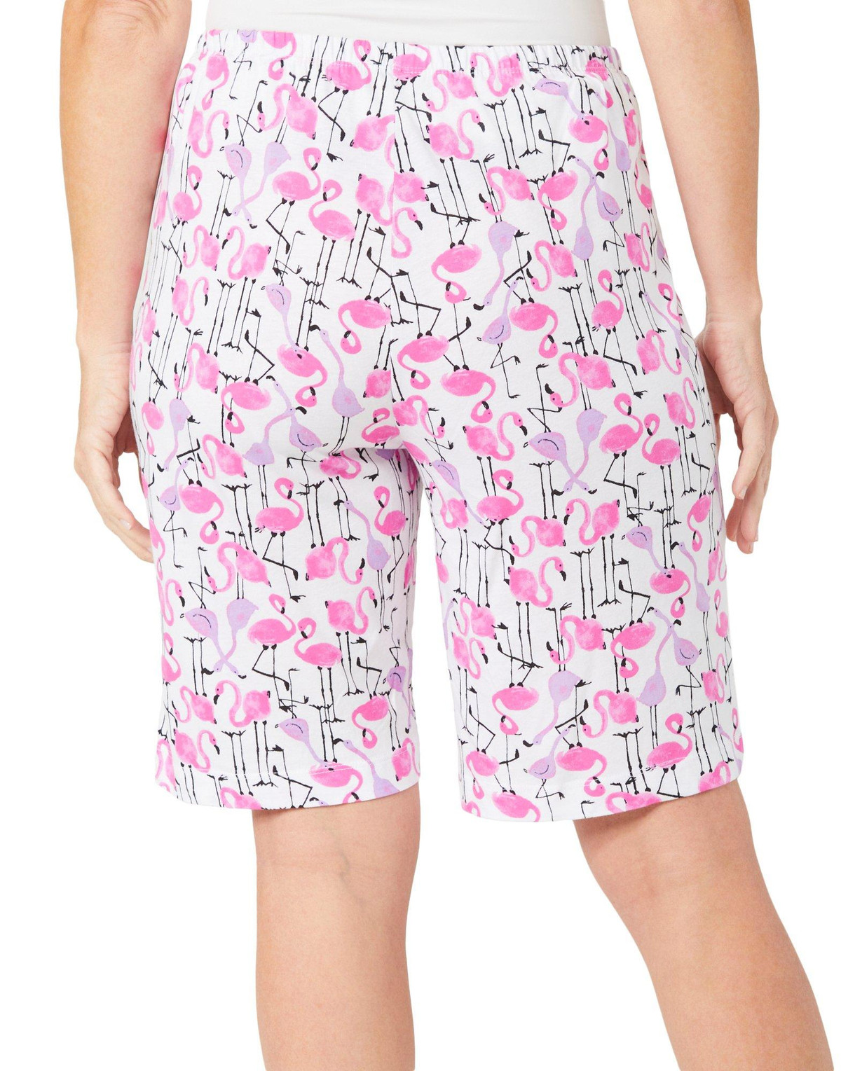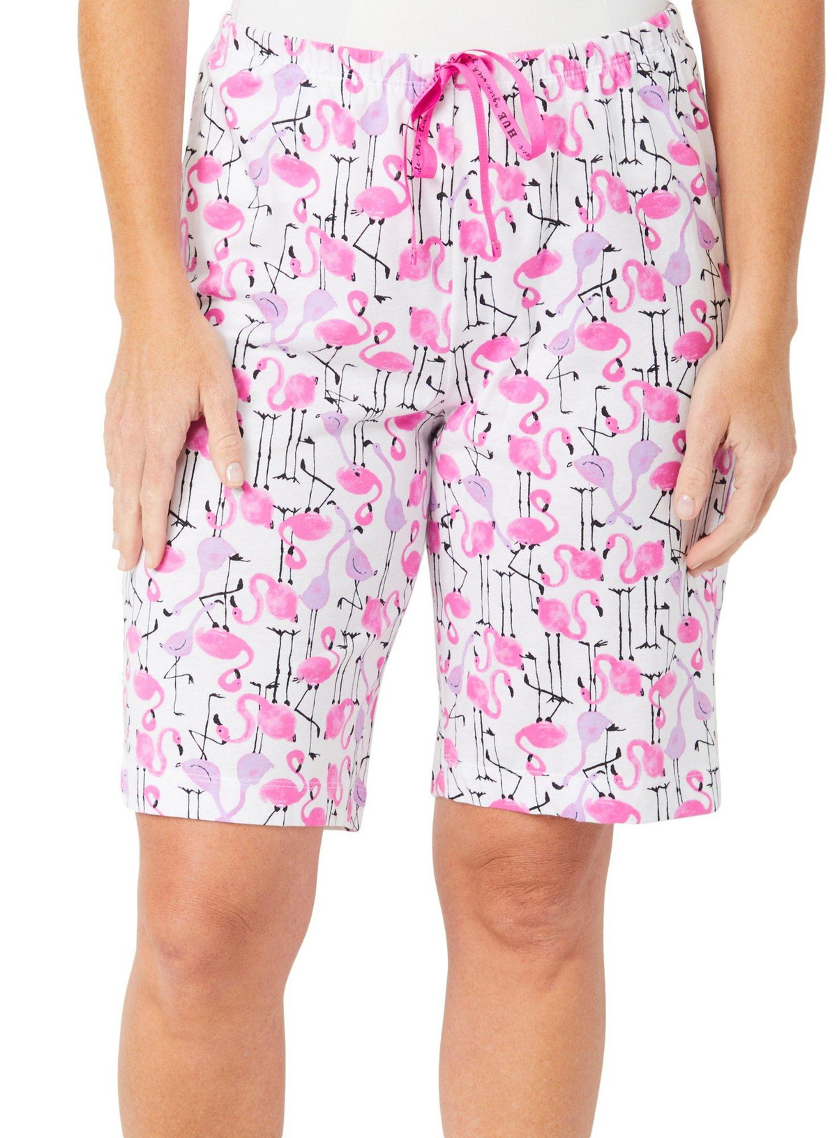 Add a playful touch to your lounge look with the Womens Flamingo Strut Pajama Shorts. Featuring a charming flamingo print, a comfy drawstring waistband, 10 inch inseam, and a relaxed Bermuda length, these shorts are perfect for cozy nights and laid-back mornings. Fabrication 60% cotton, 40% rayon