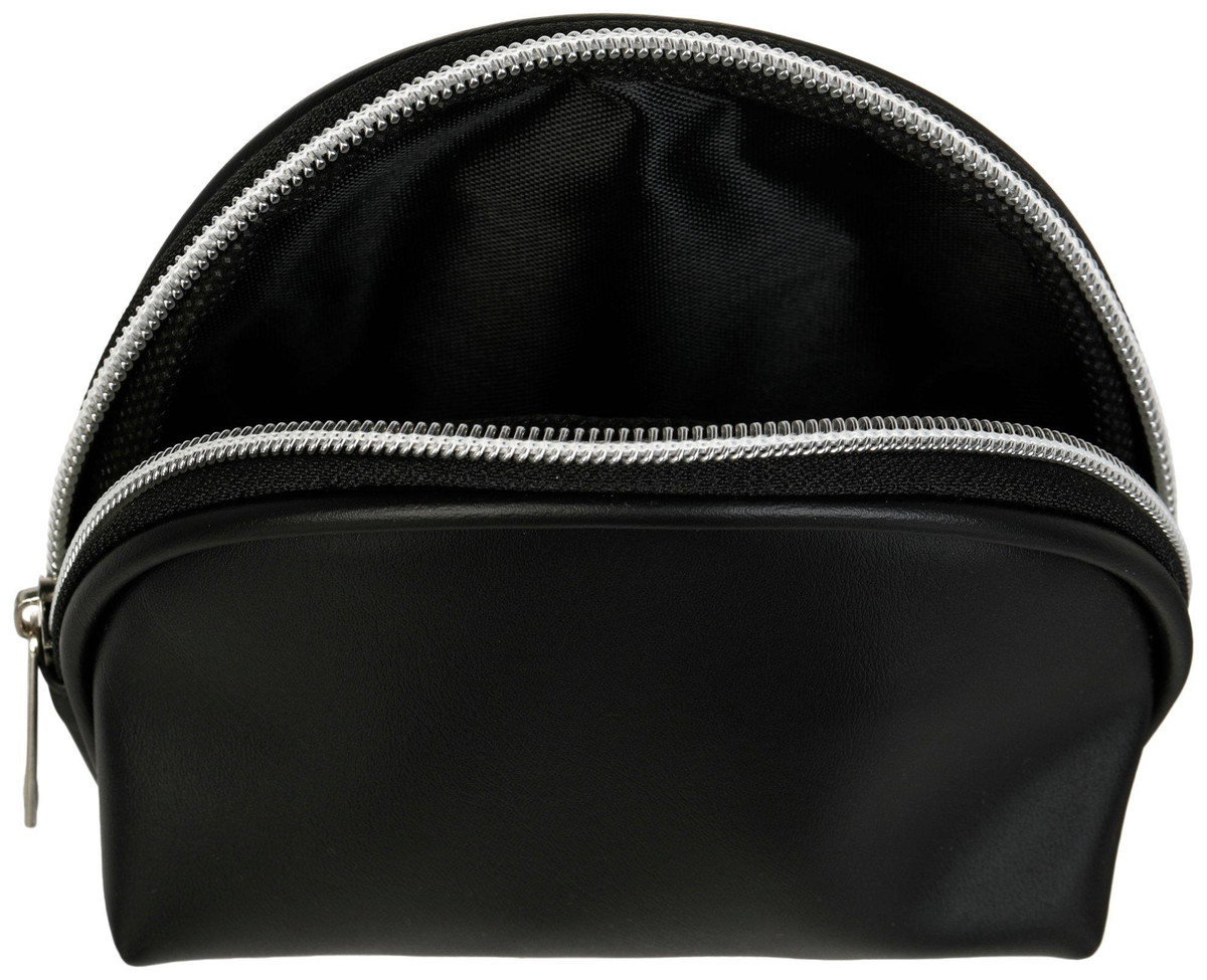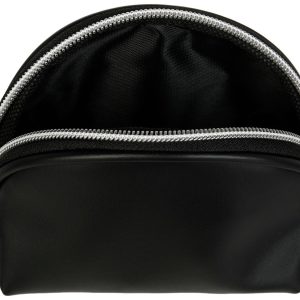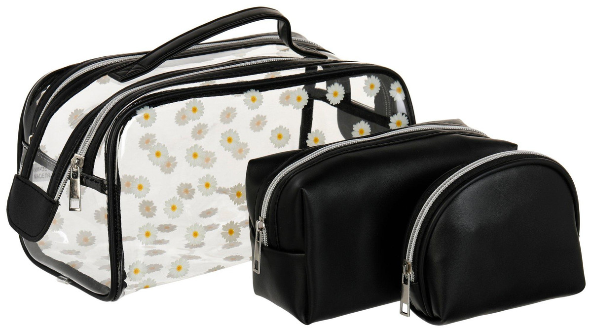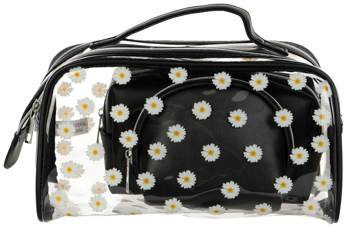 A 3-piece cosmetic bag set. The set includes one large, clear PVC bag with black trim and a daisy print, and two smaller black faux leather bags. The clear bag features a zippered closure and a top handle, while the smaller bags also have zippered closures. This set is great for organizing and storing makeup, toiletries, and other small personal items, ideal for traveling.