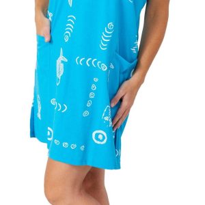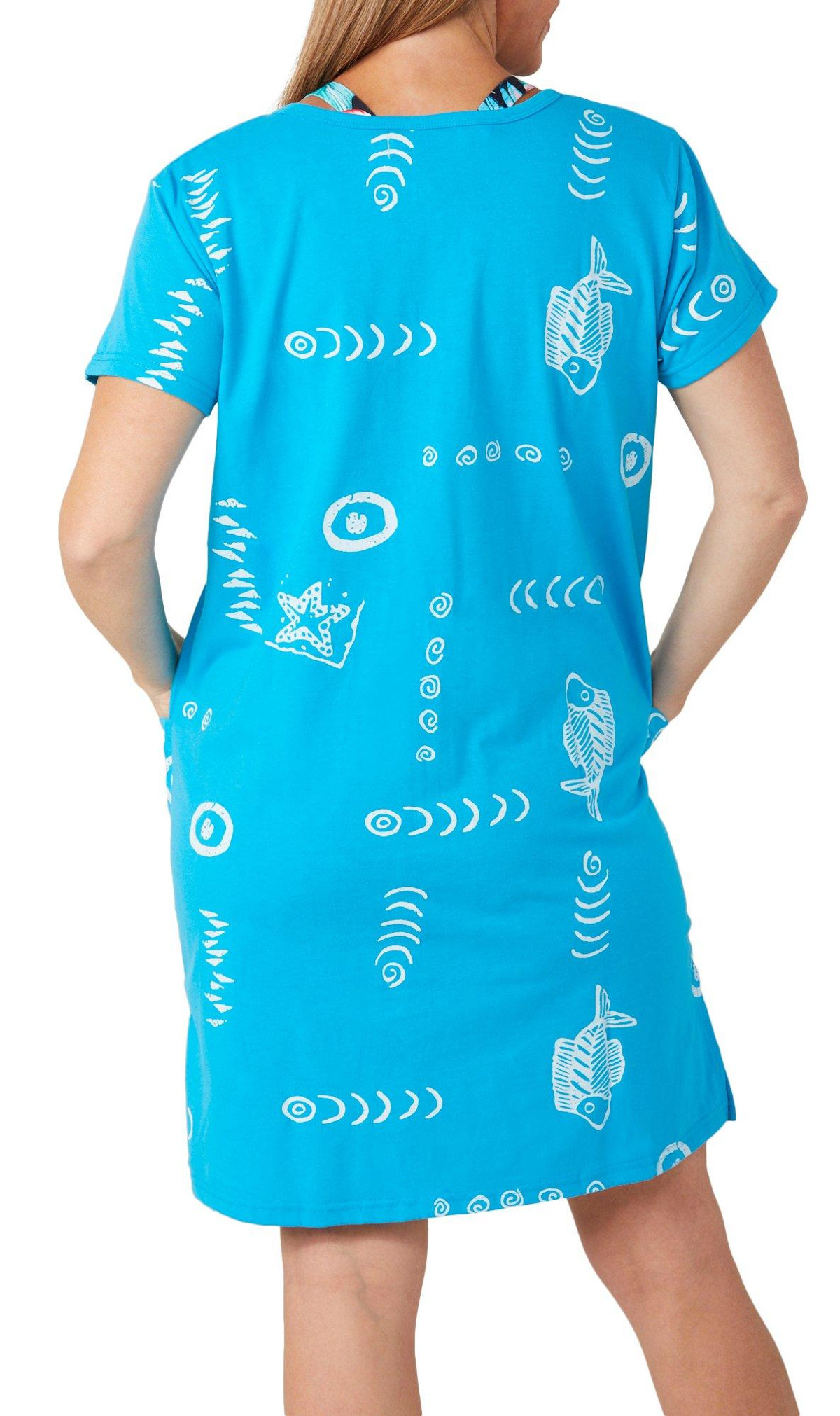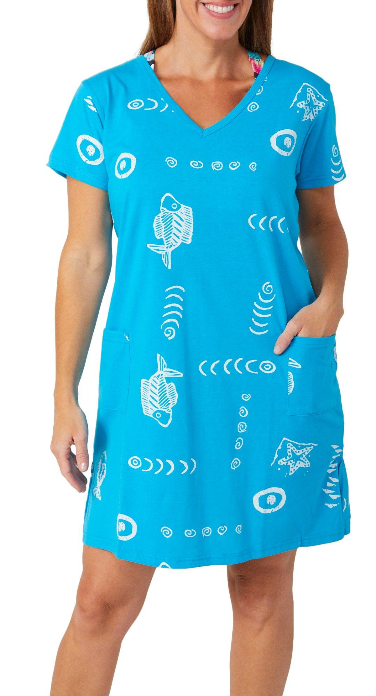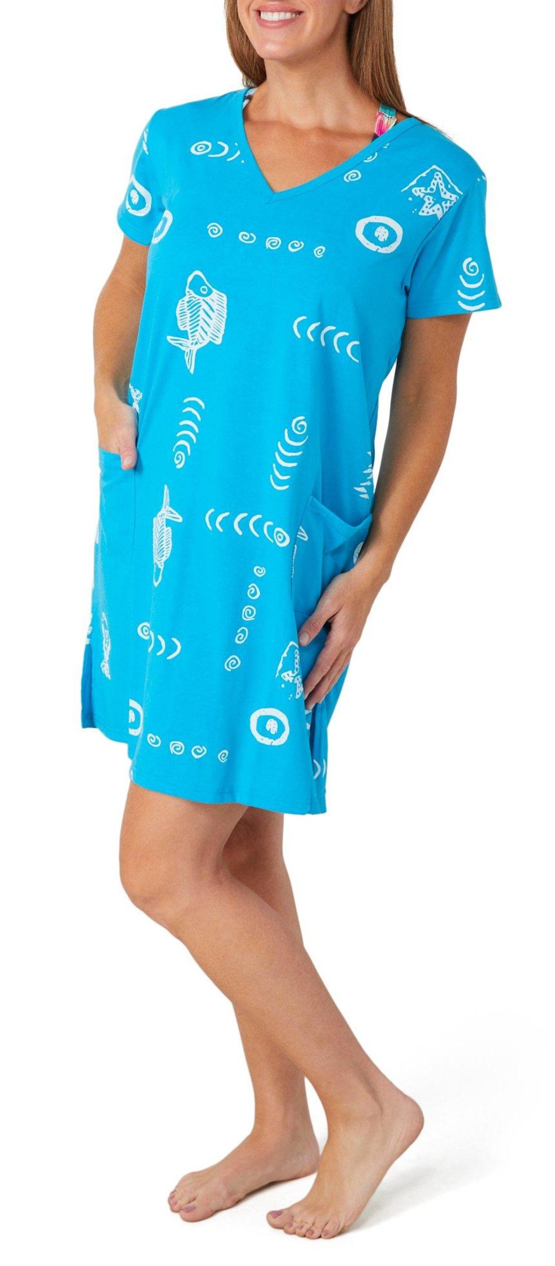 Make a splash with our Women’s Short Sleeve Fish Print Swim Coverup. Crafted from a blend of cotton and polyester, this coverup features a playful graphic fish print and a comfortable short sleeve design. The v-neckline adds a touch of elegance, while the side slip pockets provide convenience. Perfect for beach days or poolside lounging, this coverup combines style and functionality effortlessly.