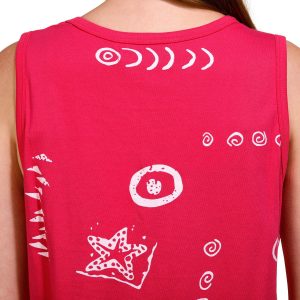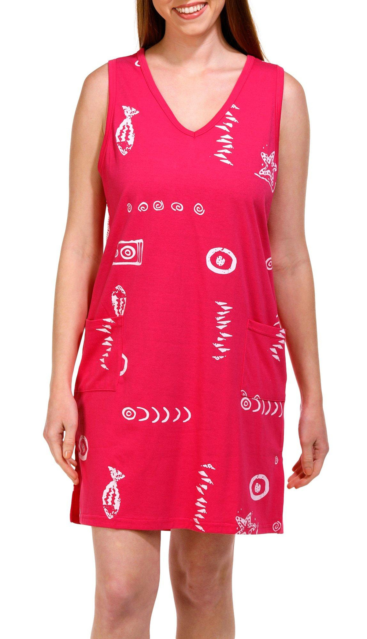 This sleeveless coverup features a solid color design on lightweight knit fabric with an all over fish screen print, a v-neckline, two front pockets and relaxed styling.