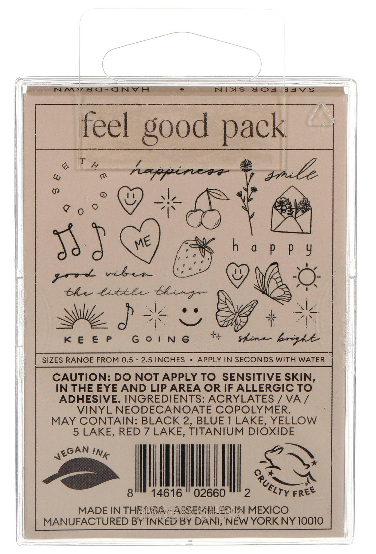 Easy to apply with just water. Hand-drawn designs. Vegan, Cruelty-Free, Non-Toxic, Waterproof Ink. Sizes range from ½ inch to 2 inches. Lasts a few days up to 2 weeks.