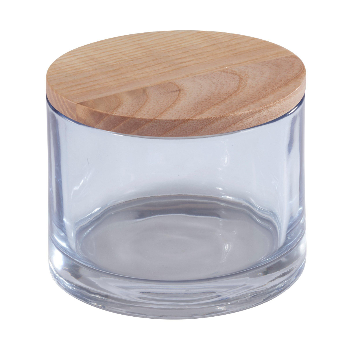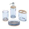 Refresh your bathroom décor with the Izod Cove Blue Glass 3 Pc. Bath Set. It features weighted blue glass pieces with naturally colored wood tops and bases. The set includes one lotion dispenser (2.76 in. x 2.76 in. x 7.80 in.) one covered jar (4.25 in. x 4.25 in. x 3.46 in.) and one vanity tray (9.25 in. x 5.20 in. x 1.57 in.). Other matching pieces available.