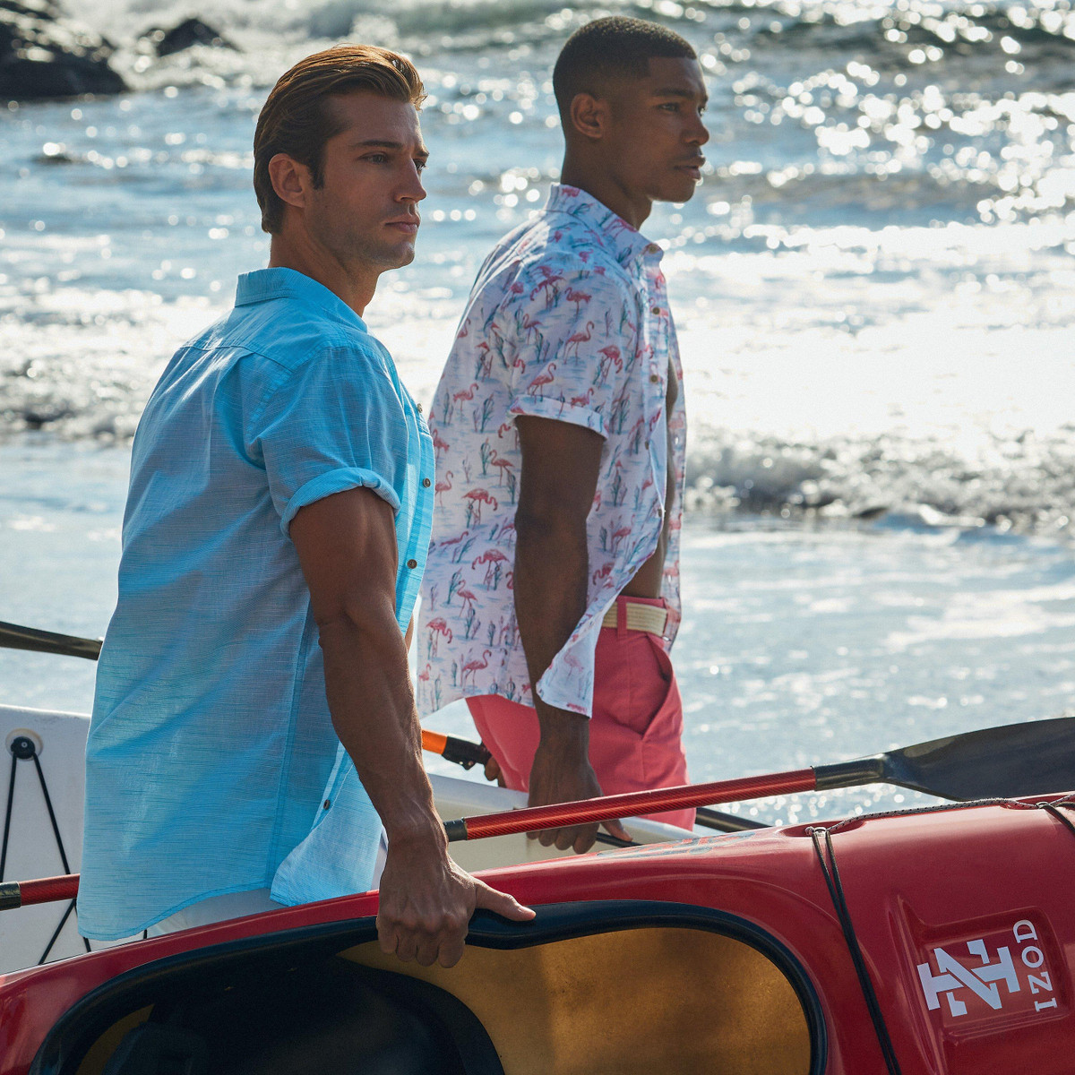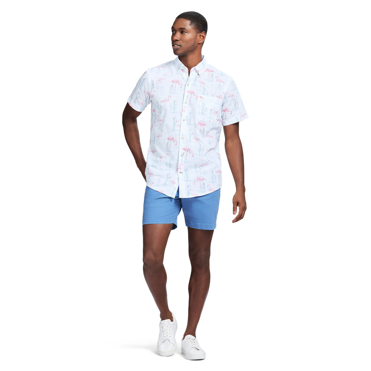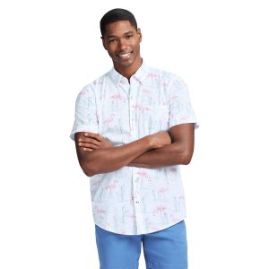 IZOD Men's Chambray Flamingo Short Sleeve Buttoned Shirt