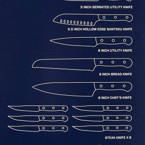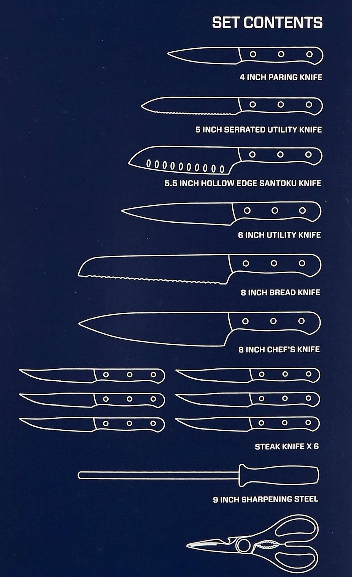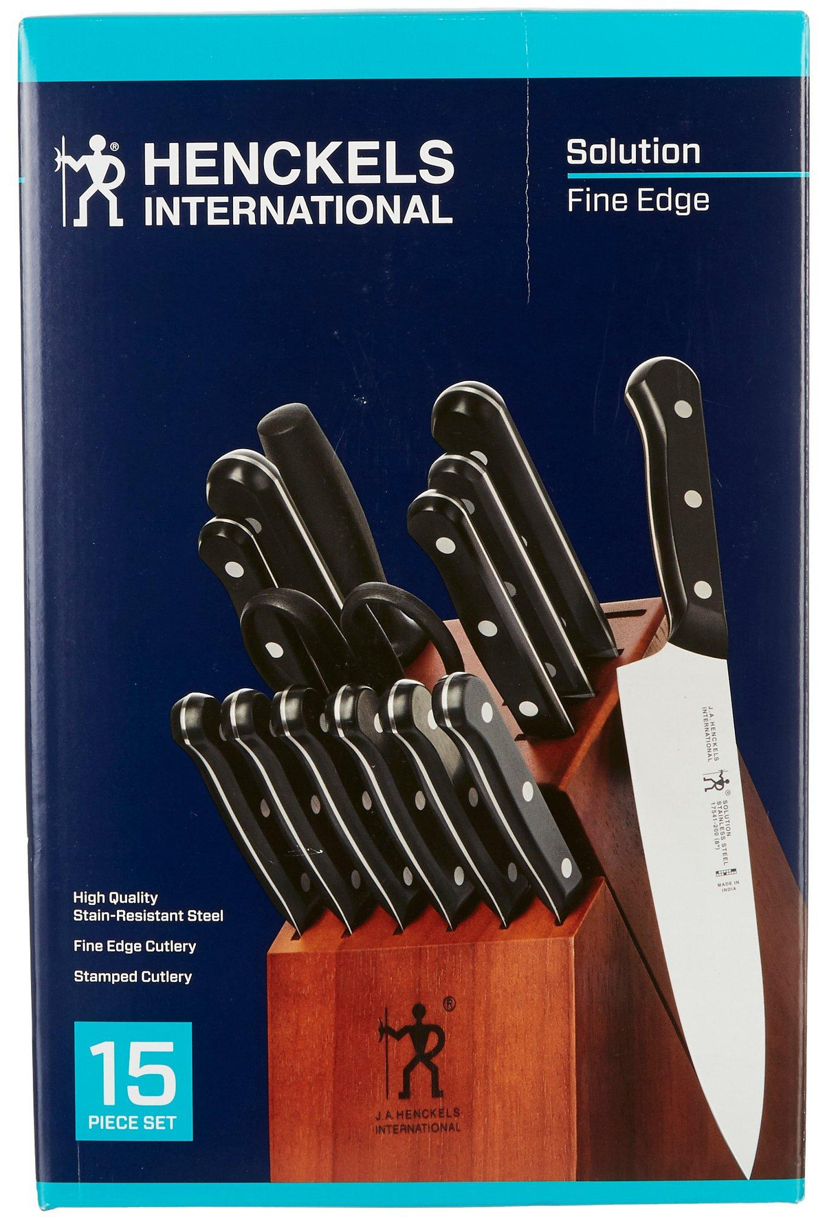 J.A. Henckels offers confidence with each cut. This 15-pc. knife block set features a satin-finish carbon steel blade with fine edge for precision cutting, stamped blade construction is lightweight, and triple rivet handles. Set includes 4” paring knife, 5” serrated knife, 5.5” Santoku knife, 6” utility knife, 8” Chef knife, 8” bread knife, 9” sharpening steel, (6) 4.5” steak knives, kitchen shears, and a hardwood knife block. Measures 9.75”L x 5.5”W x 16.75”H.