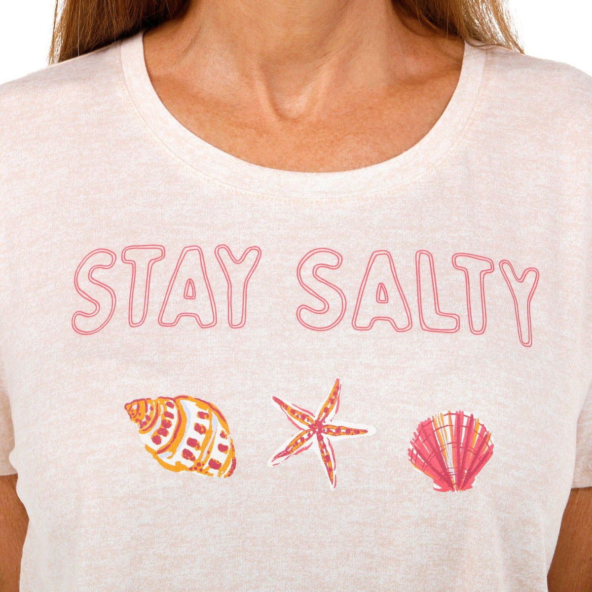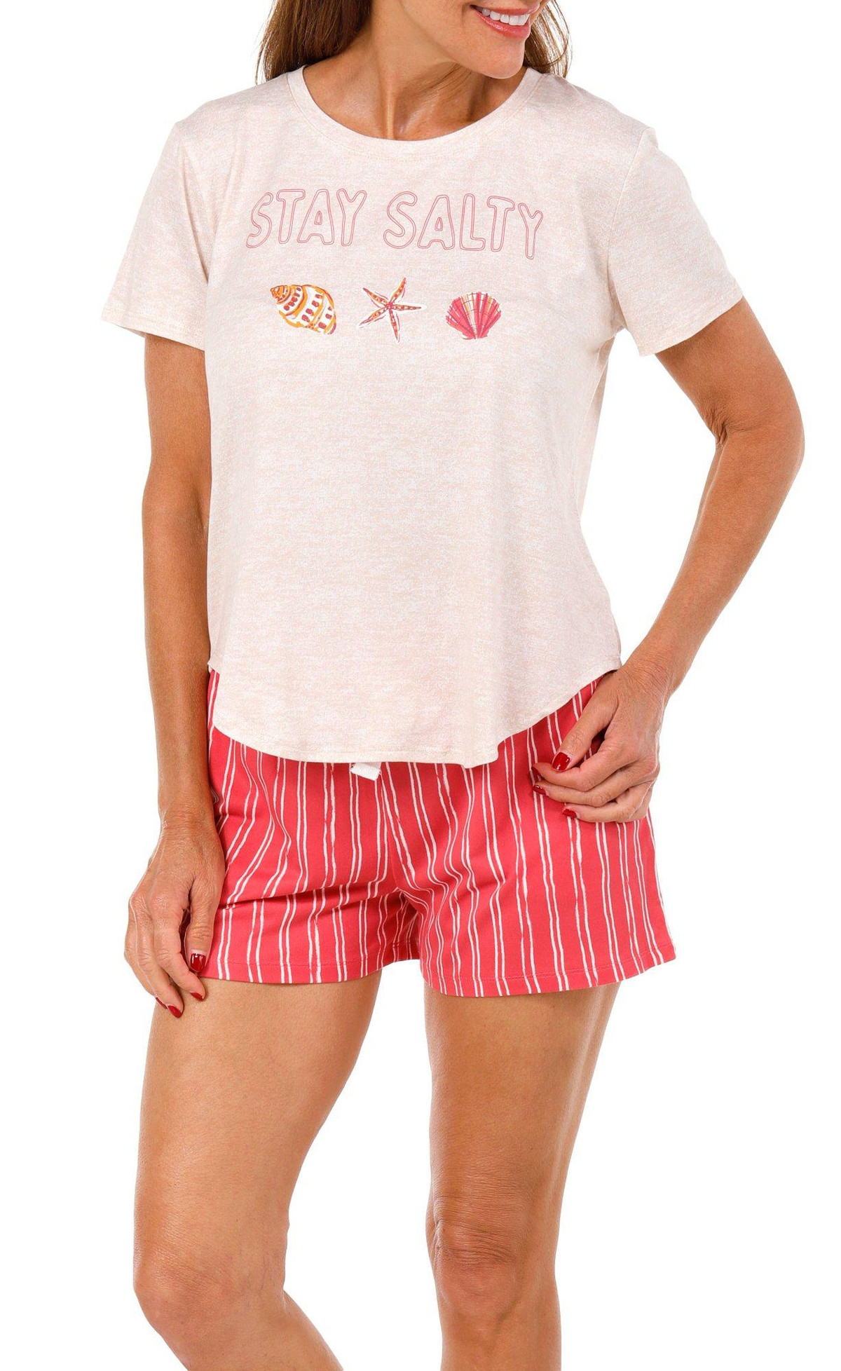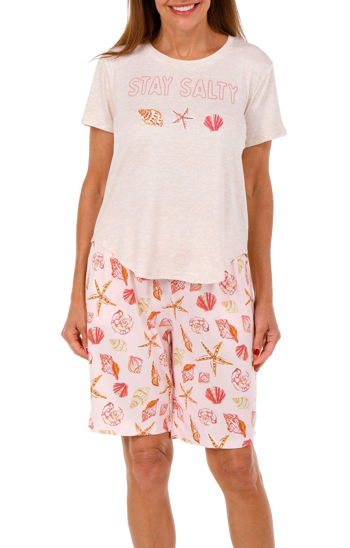 Keep it coastal and comfy with our Women’s 3 Pc Shanty Shells Sleepwear Set. Featuring a short sleeve top with a playful Stay Salty graphic and two pairs of printed shorts, this set offers mix-and-match style and soft comfort. Fabrication 95% polyester, 5% spandex
