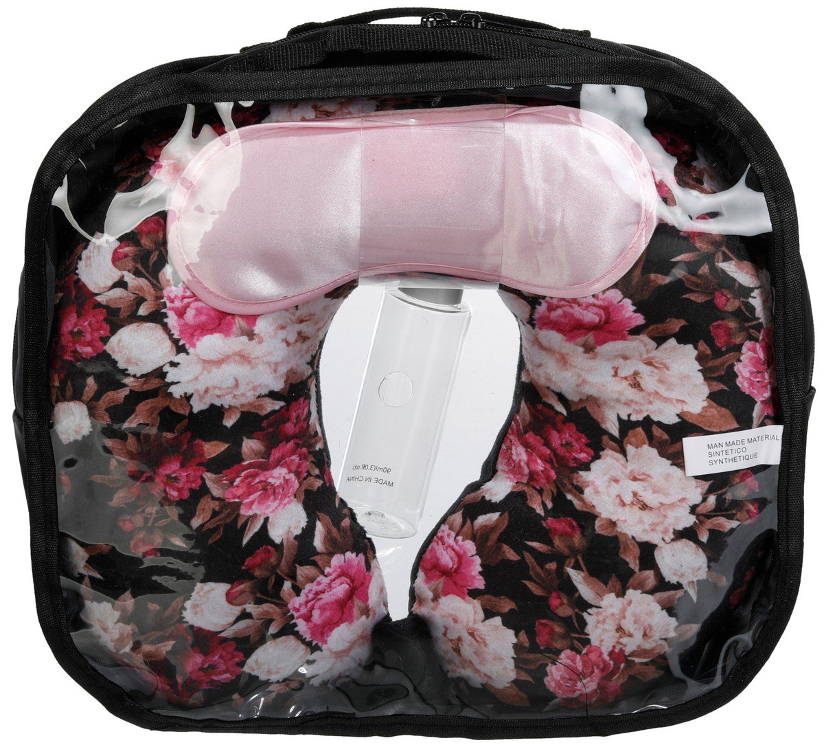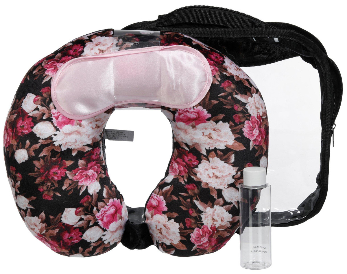 Travel in comfort and style with the Jessica McClintock 4 piece travel pillow set. Includes a soft floral travel pillow, matching eye mask, convenient travel bottle, and reusable PVC bag for easy packing. Designed to keep essentials organized while adding a touch of elegance to any journey.
